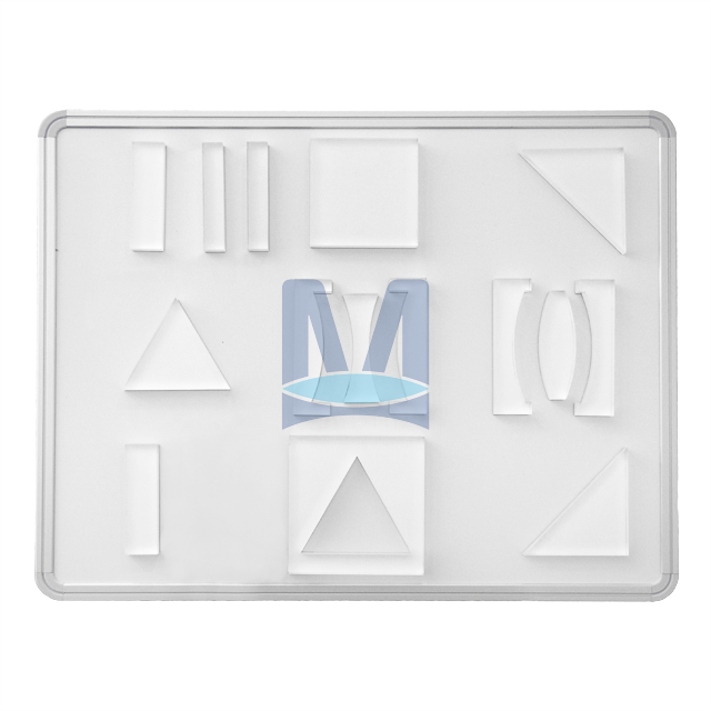 Optické prvky: bikonkávní vzdušná čočka, bikonkávní skleněná čočka, bikonvexní vzdušná čočka, bikonvexní skleněná čočka, vzdušný hranol, rovnostranný hranol, 2× pravoúhlý hranol, 2× rovinné zrcadlo, čtvercová planparalelní destička, 2× obdélníková čtvercová planparalelní destička