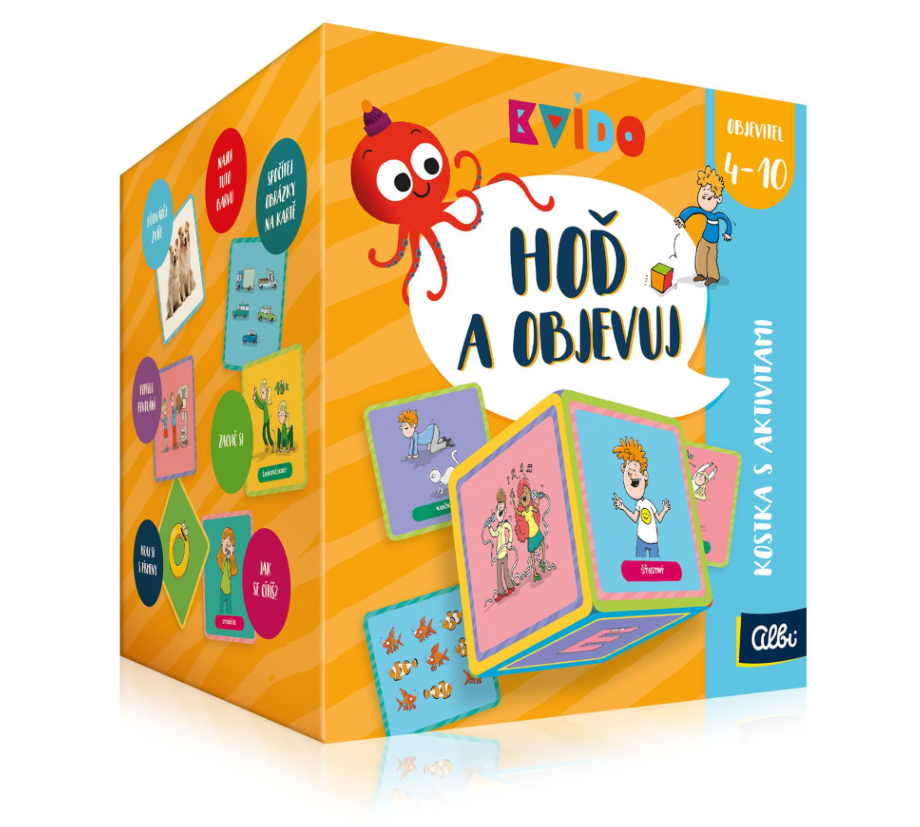 Hra obsahuje: měkkou textilní kostku s průhlednými kapsami, 53 oboustranných karet a návod k mnoha aktivitám.