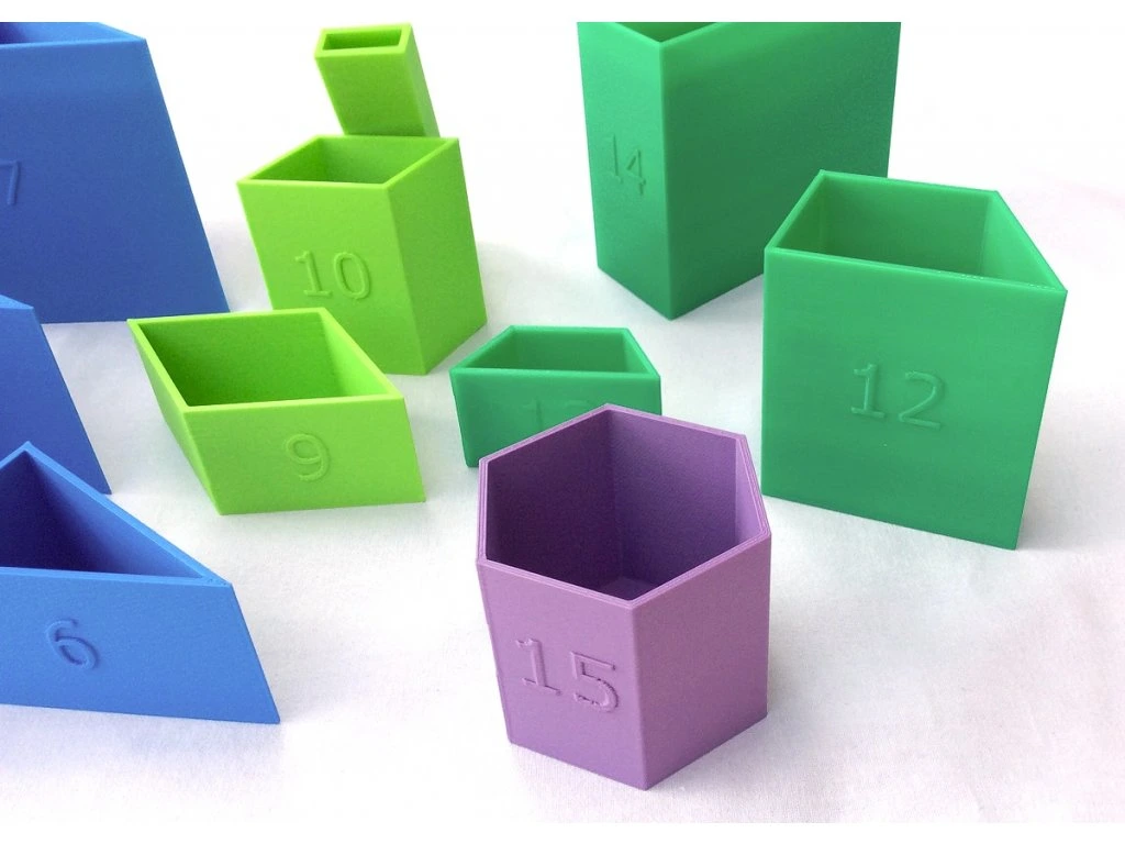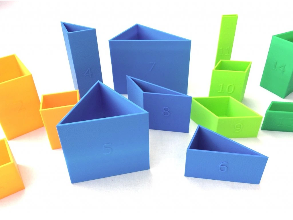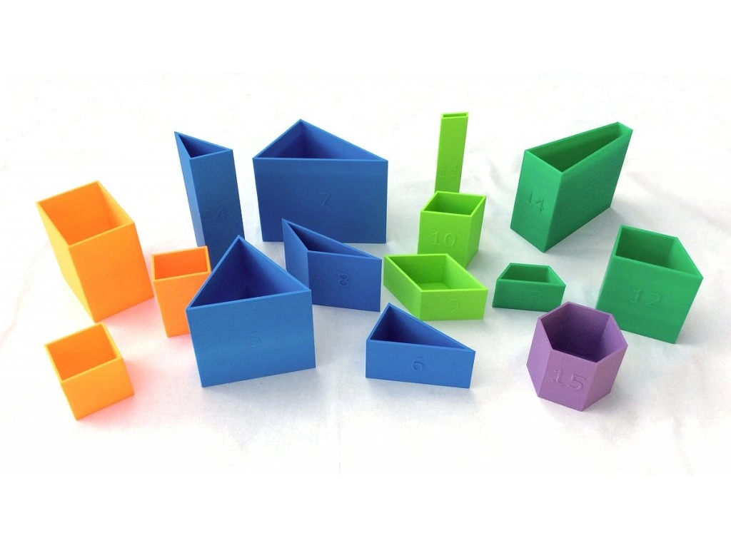 Sada hranolů obsahuje 15 různých hranolů, které pokrývají kompletně výuku objemu a geometrie těles na základní škole. Součástí sady jsou také karty se zadáním 13 úkolů pro každý hranol, což dohromady poskytuje 195 různých úloh. Sada obsahuje i řešení všech úkolů, přičemž u každého je uvedeno i měření rozměrů hranolu, takže žák snadno rozpozná, zda případná chyba vznikla při výpočtu nebo při měření.