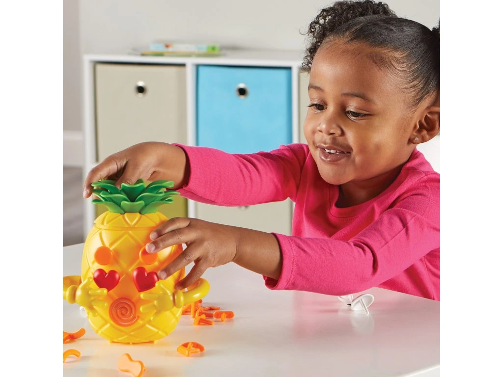 Tento kreativní set obsahuje 30 dílů, které umožňují dětem skládat různé obličejové výrazy na těle ananasu a tím objevovat širokou škálu emocí. Jednoduché uchycení a přemisťování obličejových částí je vhodné i pro malé děti.