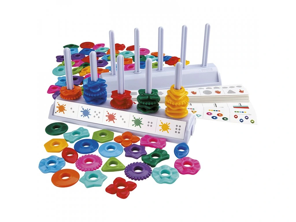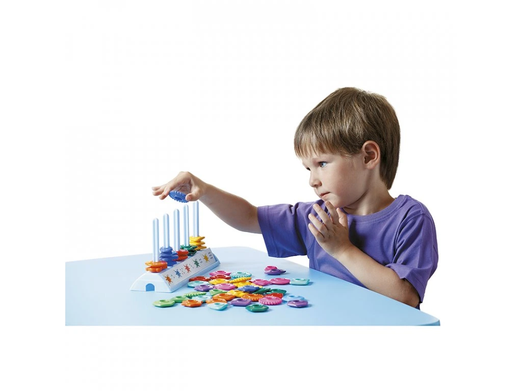 Počítací dílky jsou ve tvaru geometrických tvarů a v různých barvách. Děti se tak učí rozlišovat jednotlivé tvary a barvy. Mohou je pojmenovávat a dle vzoru nebo zadání učitele plnit úkoly při "plnění" počitadla. Děti mohou pracovat i v párech.