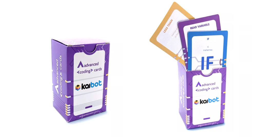 KaiBot pokročilé kódovací karty jsou sada 100 karet, které dětem umožňují vytvářet různé interaktivní programovací projekty. Karty zahrnují pohyb, logiku, funkce, opakování, podmínky, proměnné, SEL, barvy a další. Jsou vyrobeny z odolného materiálu s voděodolnou úpravou.