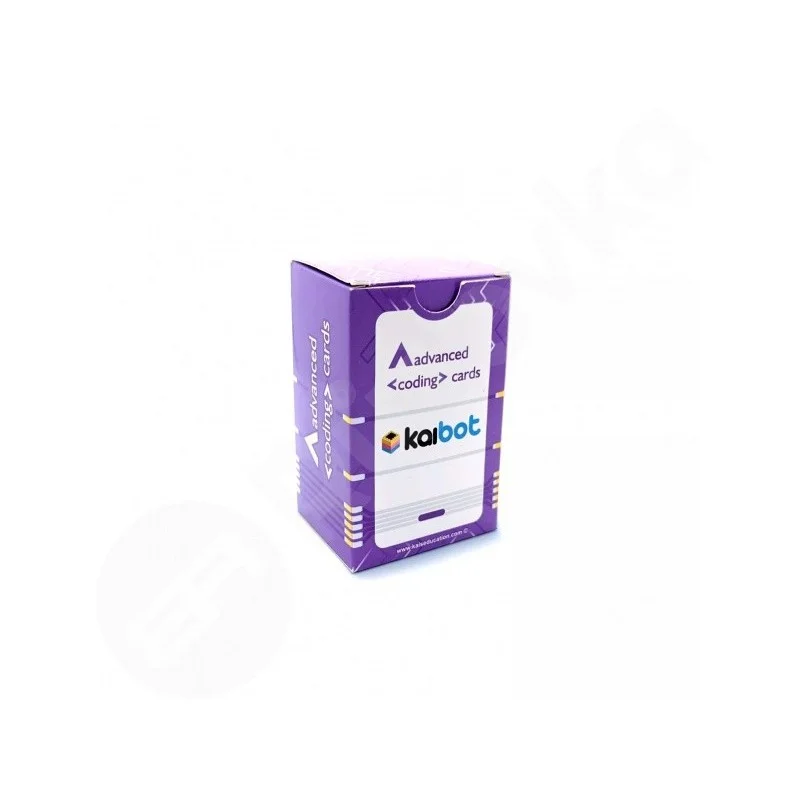KaiBot pokročilé kódovací karty jsou sada 100 karet, které dětem umožňují vytvářet různé interaktivní programovací projekty. Karty zahrnují pohyb, logiku, funkce, opakování, podmínky, proměnné, SEL, barvy a další. Jsou vyrobeny z odolného materiálu s voděodolnou úpravou.