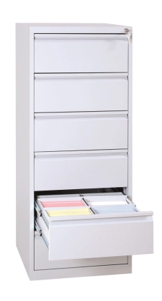 Šestizásuvkové kovové kartotéky na formát A5, celková šířka 530, výška 1320, hloubka 620 mm, v barvě světle šedé RAL 7035.