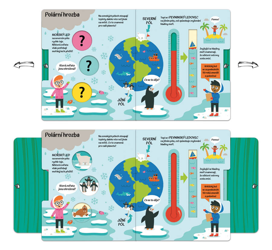 Děti se prostřednictvím srozumitelných textů, vtipných ilustrací a originálních vytahovacích záložek dozví, co je to vlastně klimatická změna, proč se klima mění právě nyní a jaké dopady má na život na Zemi.