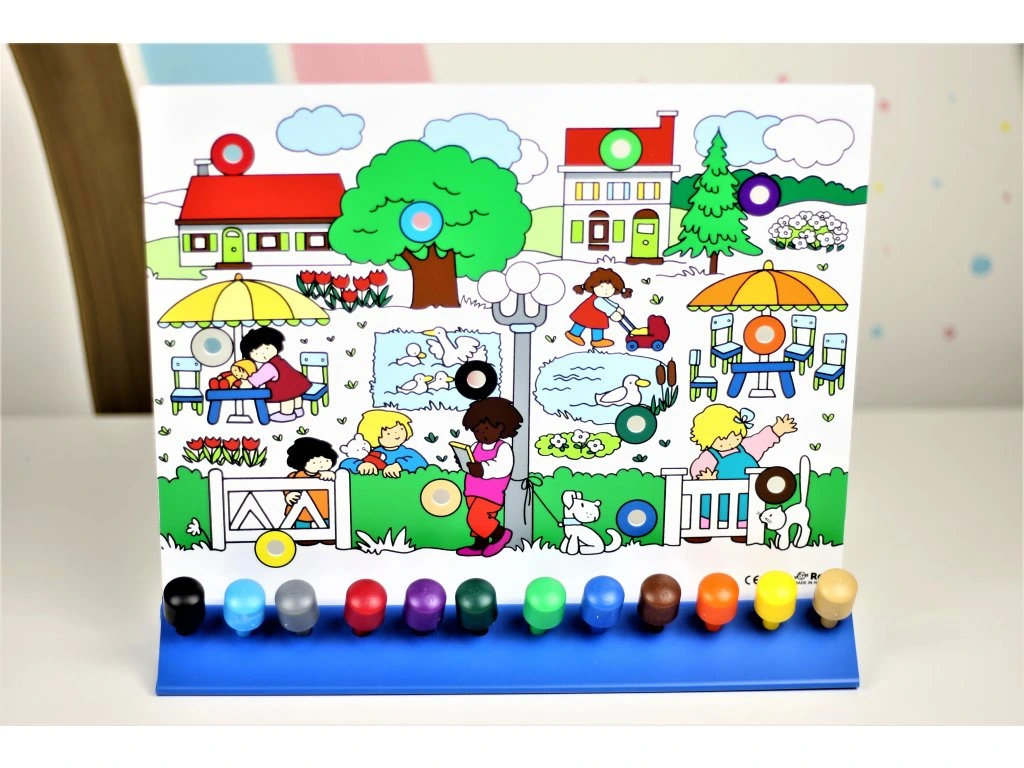 Jeden dává rady ke konkrétnímu obrázku a druhý musí zjistit, který obrázek odpovídá popisu a dle toho vloží barevný kolíček do otvoru na tabuli.