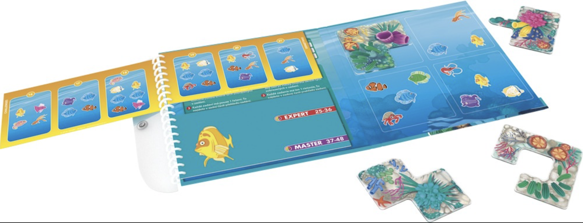 Umístěte 4 magnetické herní dílky na herní plán tak, že budou vidět pouze rybičky zobrazené v zadání a ostatní se schovají.