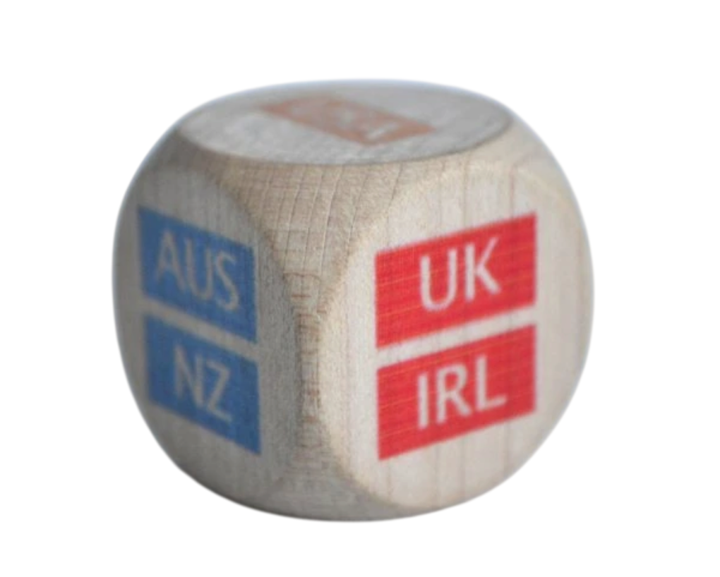 Ahoj, jsem dřevěná Kostka na hru DACHwisser nebo ENwiser!