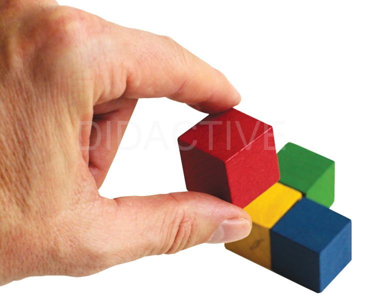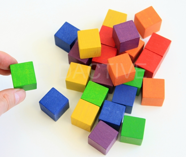 Barevné dřevěné kostky z kvalitního dřeva s hranou 2,5 cm nabízejí nekonečné možnosti využití při výuce matematiky a geometrie.