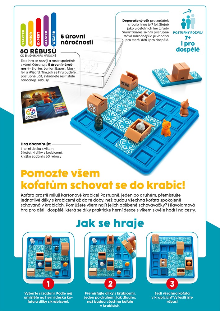 Hra Koťata a krabice je ideální pro jednoho hráče, kteří si rádi lámou hlavu nad logickými hádankami. Je vhodná pro děti i dospělé, kteří hledají zábavnou a stimulující výzvu. S desítkami úloh s různou úrovní obtížnosti se nikdy nebudete nudit! A pokud si nevíte rady, na konci brožurky najdete řešení a dokonce i doporučené pořadí tahů pro jednodušší úlohy.