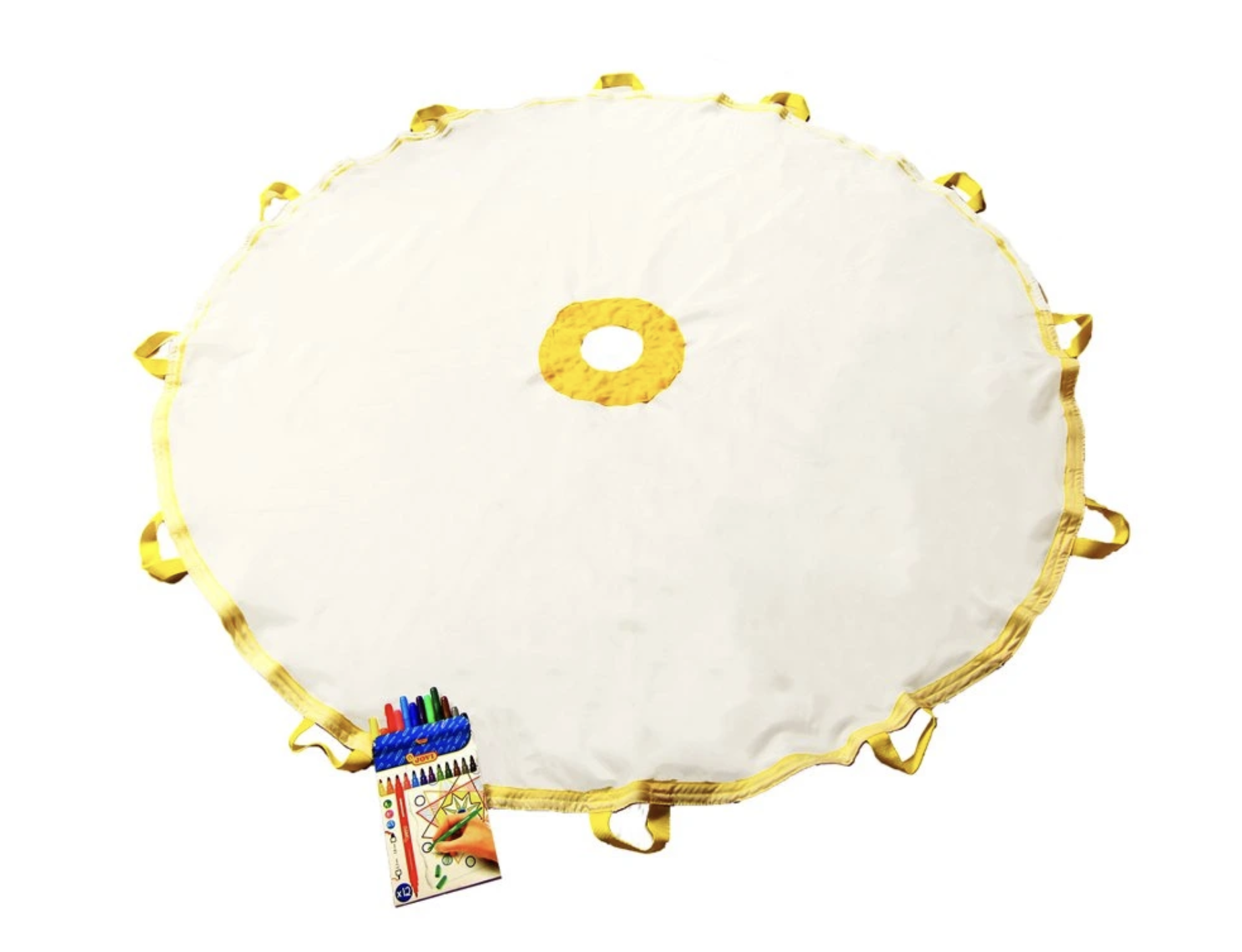 Skvělá pomůcka pro rozvoj kreativity, spolupráce a motoriky u dětí. S průměrem 1,5 metru, 12 úchyty a sadou 12 barevných fixů je tento padák ideálním nástrojem pro zábavné a interaktivní aktivity pro menší skupinu dětí. Bílou plochu si děti mohou pomocí přiložených fixů pomalovat podle vlastní fantazie nebo na určité téma. Padák lze snadno vyprat, takže je použitelný opakovaně.