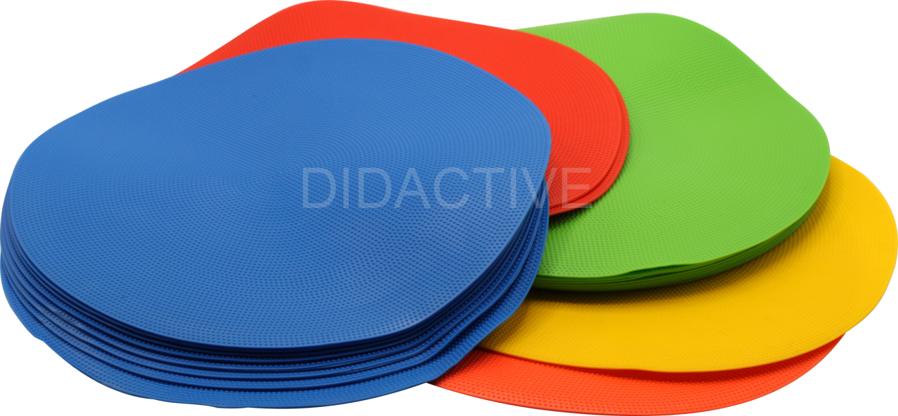 Kruhy jsou gumové, z jedné strany s mnoha malými výstupky, z druhé strany hladké. Díky svému materiálu stabilně dží a nekloužou po podkladu. Jsou dostatečně velké (průměr 30cm!).