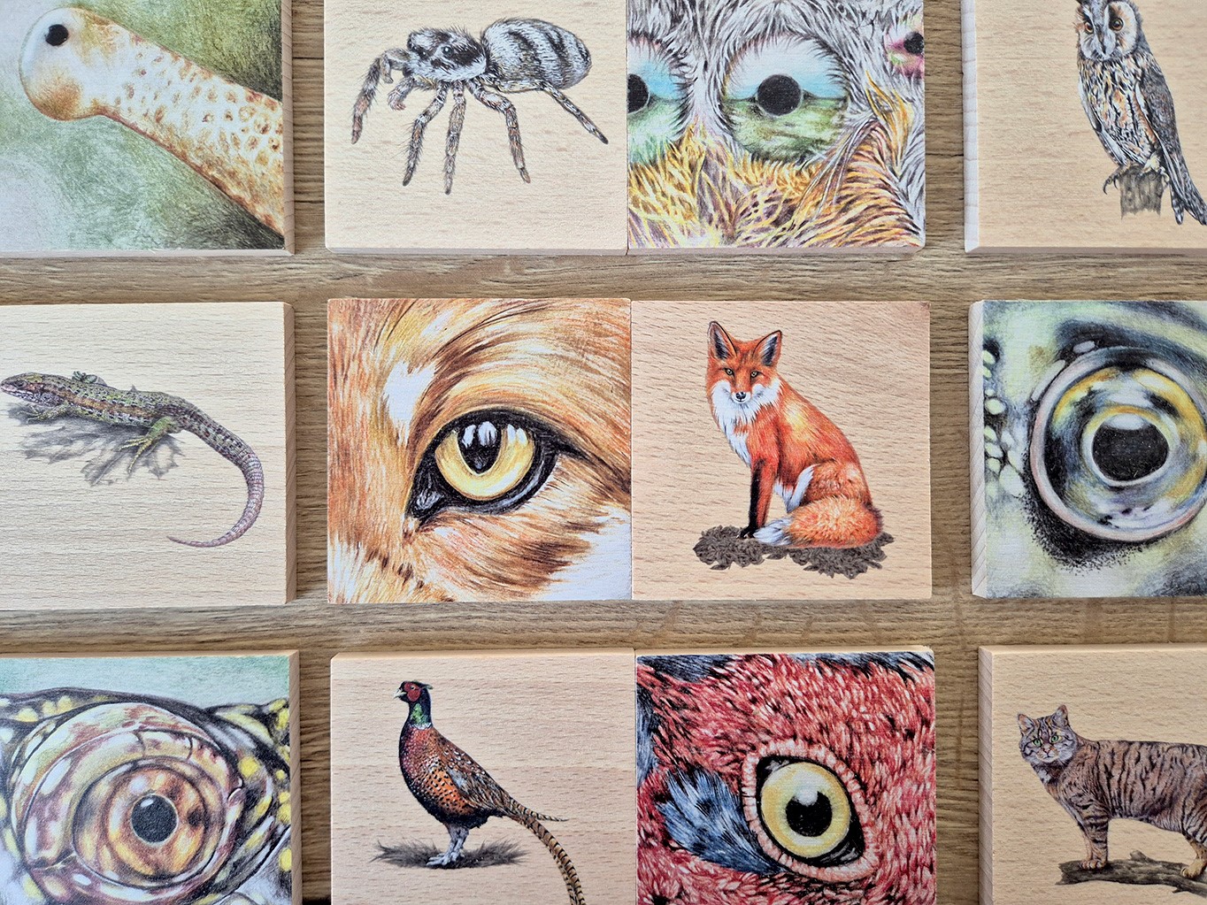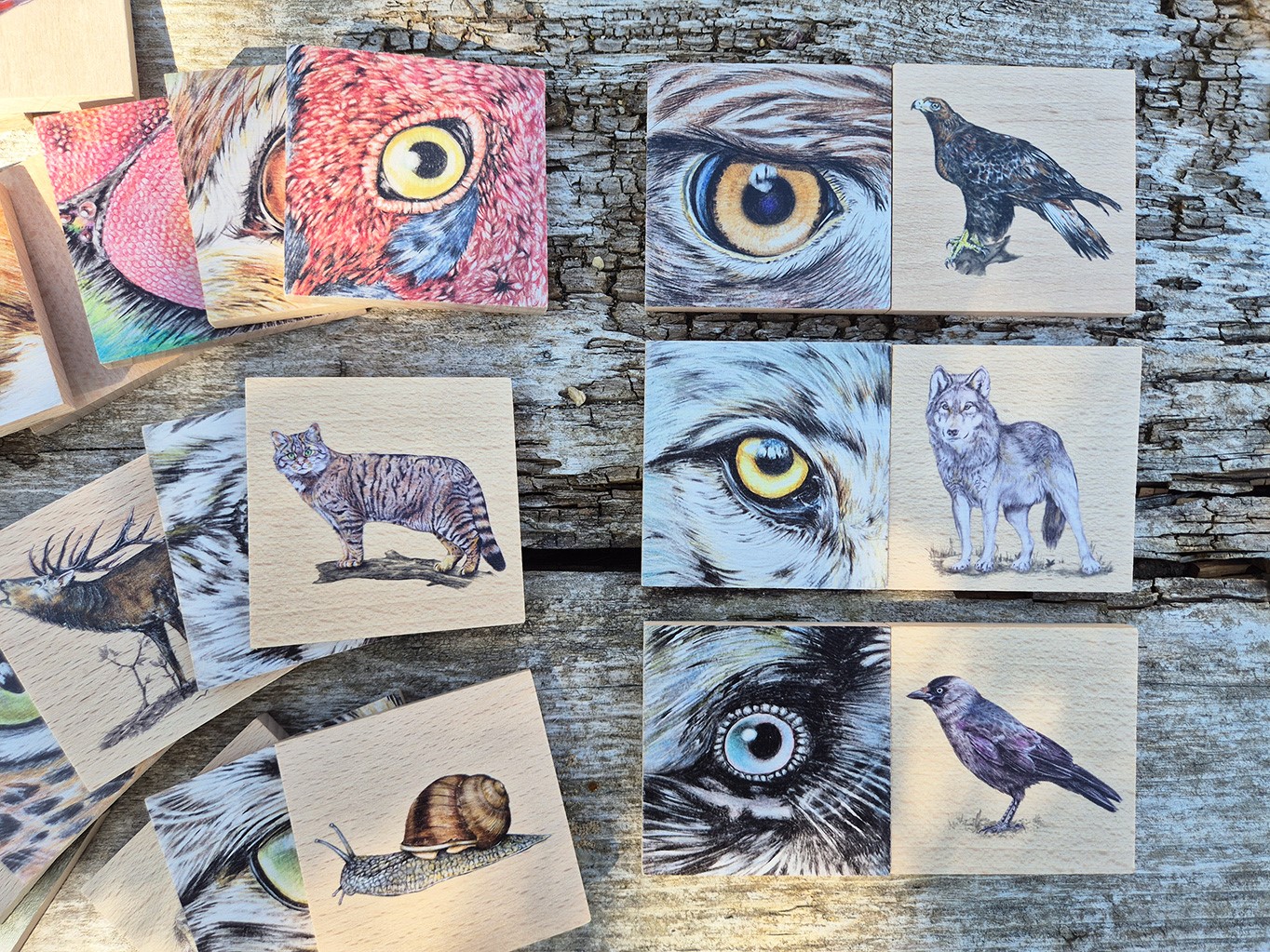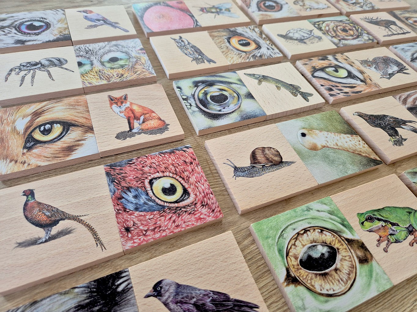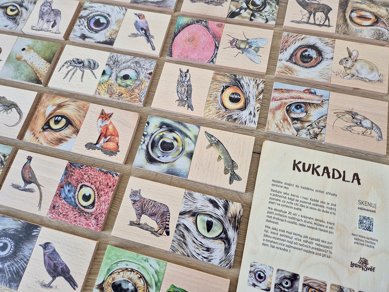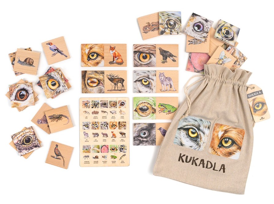 Zabavte děti hrou Kukadla! 40 dřevěných dílků s originálními ilustracemi zvířecích očí.