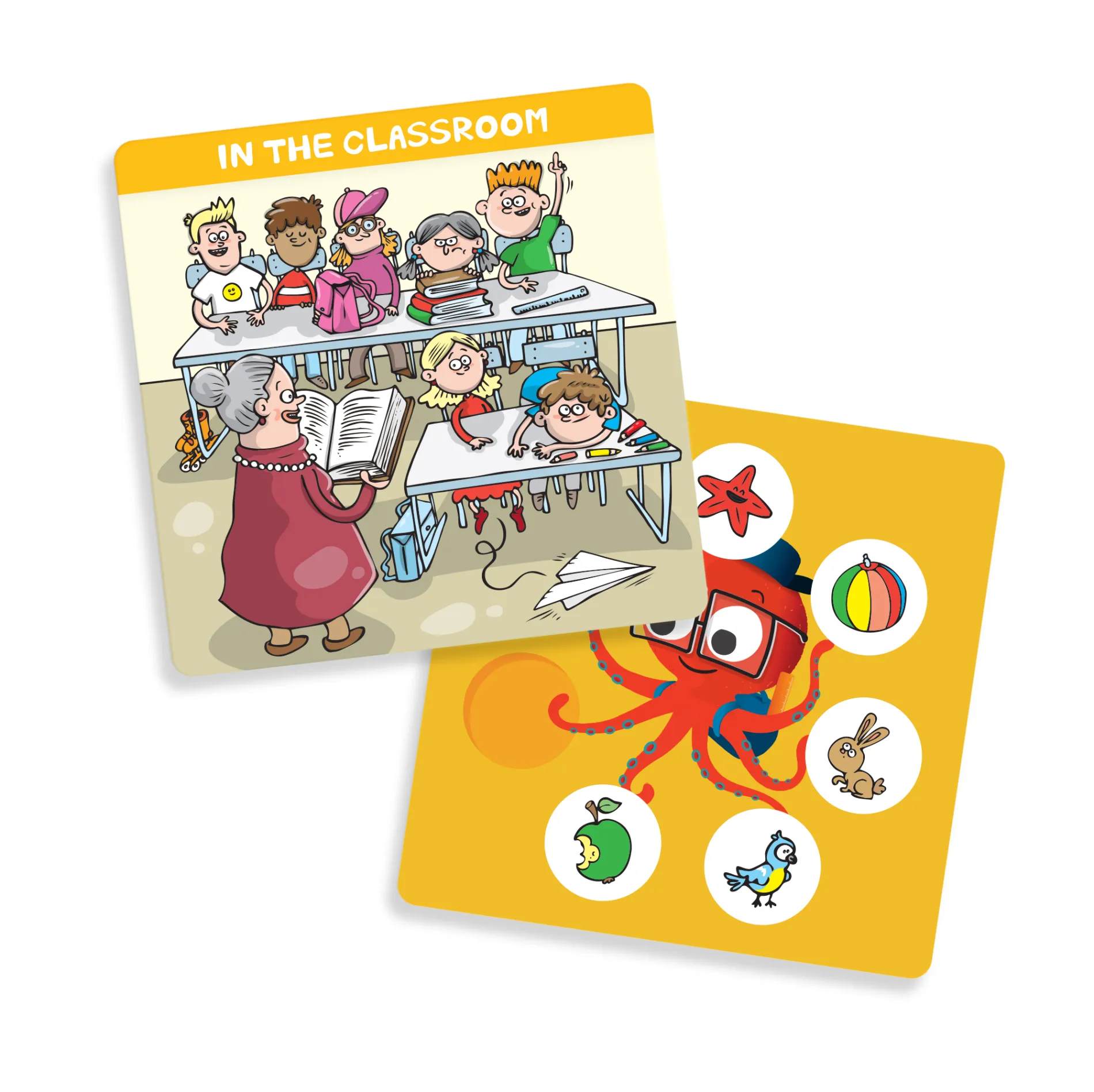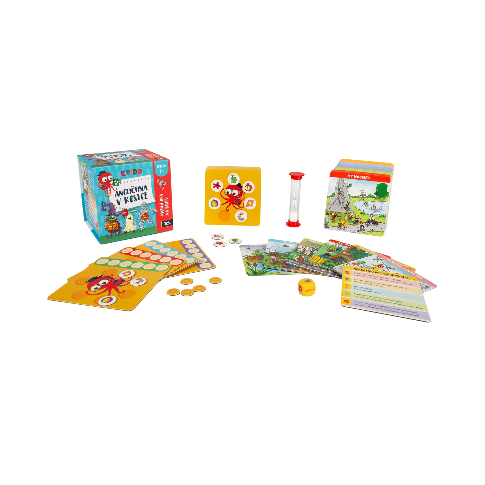 60 karet s obrázky i otázkami k danému tématu, 20 oboustranných bonusových karet pro Kvídovu paměťovku, 4 bodovací karty, 32 obrázkových žetonů pro bonusový úkol, 40 bodovacích žetonů, 1 přesýpací hodiny na 15 sekund a 1 Kvídovu hrací kostku.