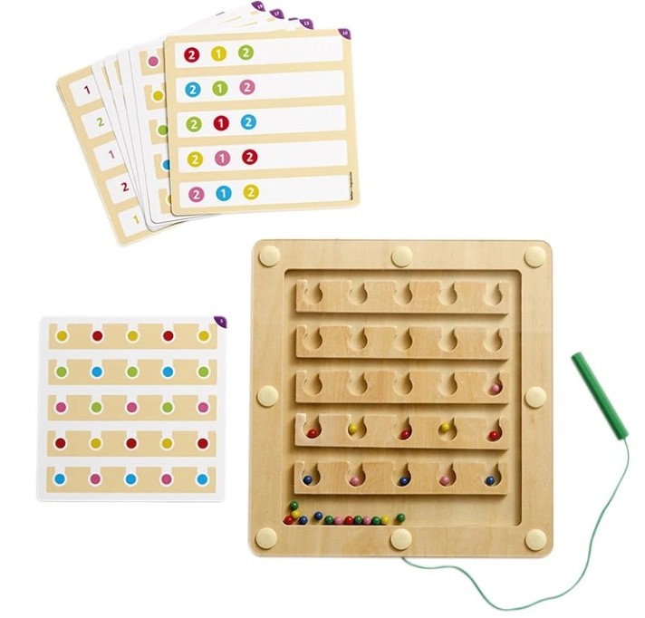 Tato interaktivní dřevěná hra pomáhá dětem pochopit základní číselné pojmy a zároveň trénovat jemnou motoriku. Pomocí magnetického pera děti přemisťují barevné kuličky a přiřazují je k odpovídajícím číslům od 1 do 5. Zábavný a efektivní způsob, jak rozvíjet logické myšlení a koordinaci pohybů.