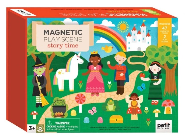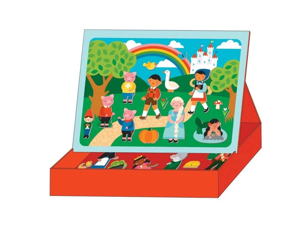 Tato přenosná sada her obsahuje 47 magnetických dílků a dvě magnetické tabulky, z nichž si můžete vybrat. Lze použít jako divadélko. Magnetickou scénku můžete i postavit díky zarážkám v krabici. Tvořte vlastní pohádkové příběhy ve dne nebo v noci.