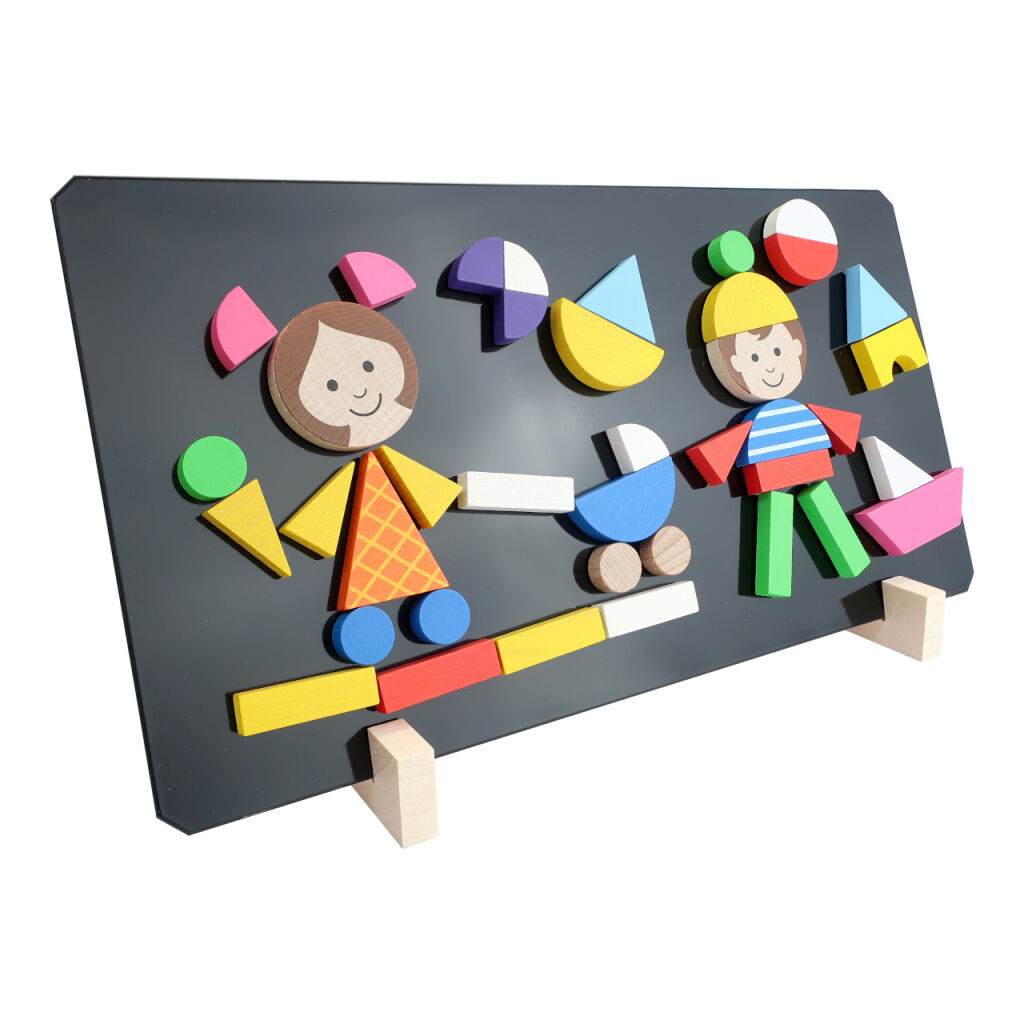 Puzzle děti obsahují magnetickou tabulku, stojánek a 37ks dřevěných dílků s magnetem, z nichž lze sestavit různé obrázky.