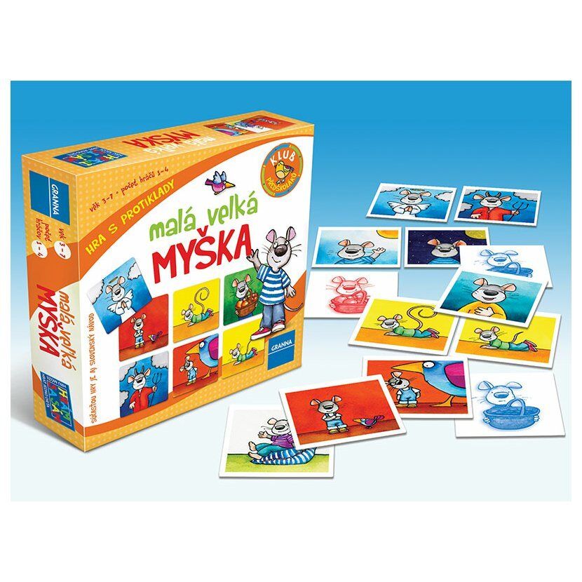 Do KLUBU PŘEDŠKOLÁKŮ patří i hra s protiklady, jejíž hlavní hrdinkou je myška. Jednou je malá, jindy velká, pak zase veselá, anebo smutná. Učí děti rozeznávat protiklady a procvičuje tak jejich postřeh, paměť i pozorovací schopnosti a zároveň jim rozšiřuje slovní zásobu. Hra pro 1 až 4 hráče od 3 do 7 let obsahuje 54 kartiček a umožňuje dvě herní varianty.