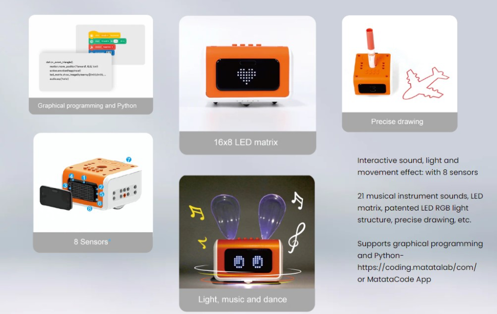 Robot podporuje grafické programování i programovací jazyk Python, což umožňuje různorodé možnosti vytváření programů a projektů. Díky této flexibilitě si můžete přizpůsobit robota svým potřebám a rozvíjet své programovací dovednosti.