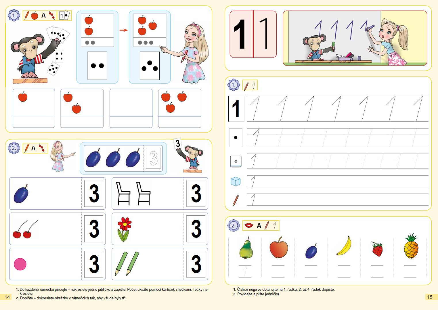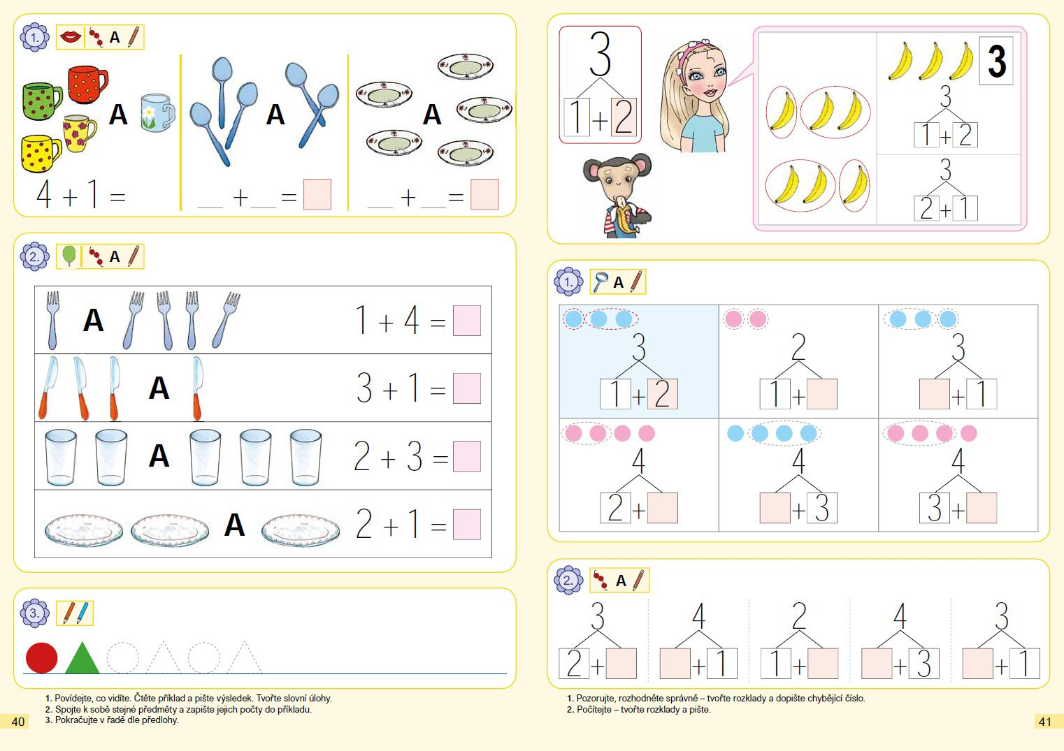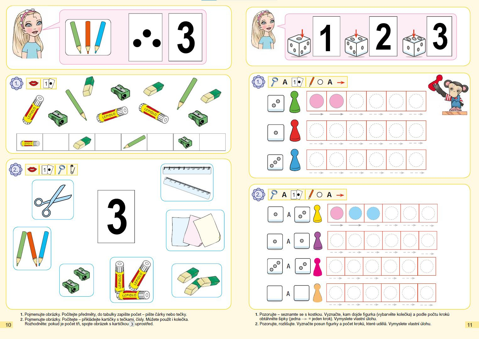 Učebnice naplňuje všechny OVU pro daný ročník. Je koncipována do 4 dílů. Učivo je rozloženo tak, aby bylo možno každí díl použít pro jedno čtvrtletí (1. díl: numerace 1-5, 2. díl: numerace 1-8, 3. díl: numerace 0-15 bez přechodu přes 10, 4. díl: numerace 0-20 bez přechodu přes 10; přechod přes 10 zařazen jako rozšiřující učivo).