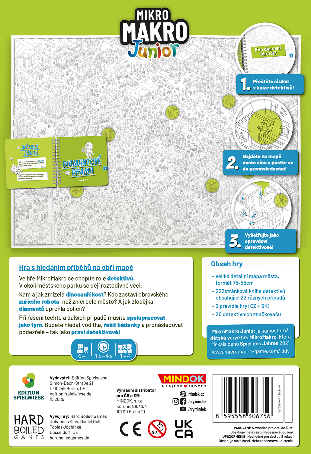 Detailní mapa města, 222stránková kniha detektivů, 20 detektivních značkovačů a 2 pravidla hry.