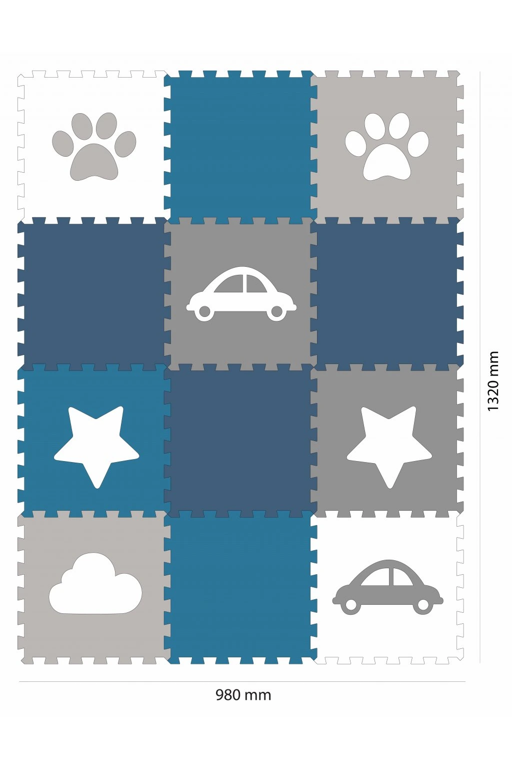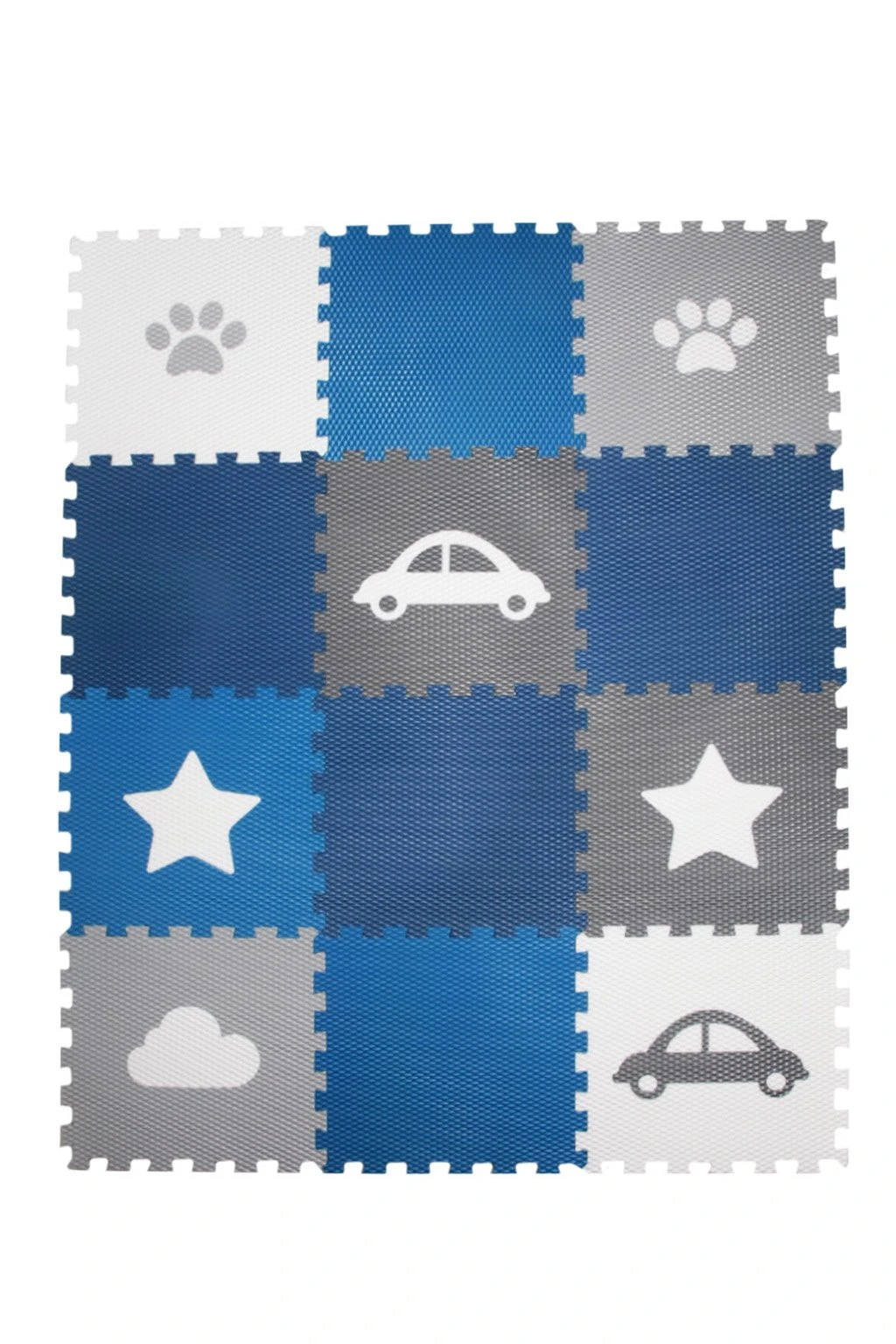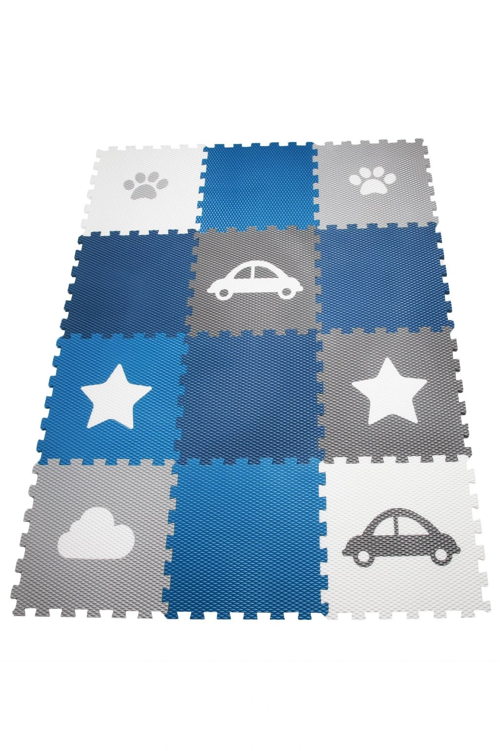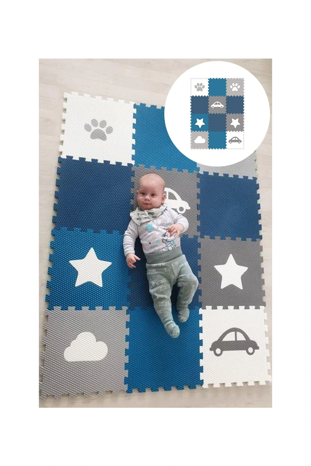Dětská pěnová puzzle podlaha Minideckfloor nabízí měkkou a bezpečnou hrací plochu s veselými motivy tlapky, hvězdy, mraku a auta. Sada obsahuje 12 dílů, které lze snadno spojovat i rozšiřovat. Podlaha skvěle tlumí nárazy, izoluje od chladu a je ideální pro hraní, lezení i první krůčky.