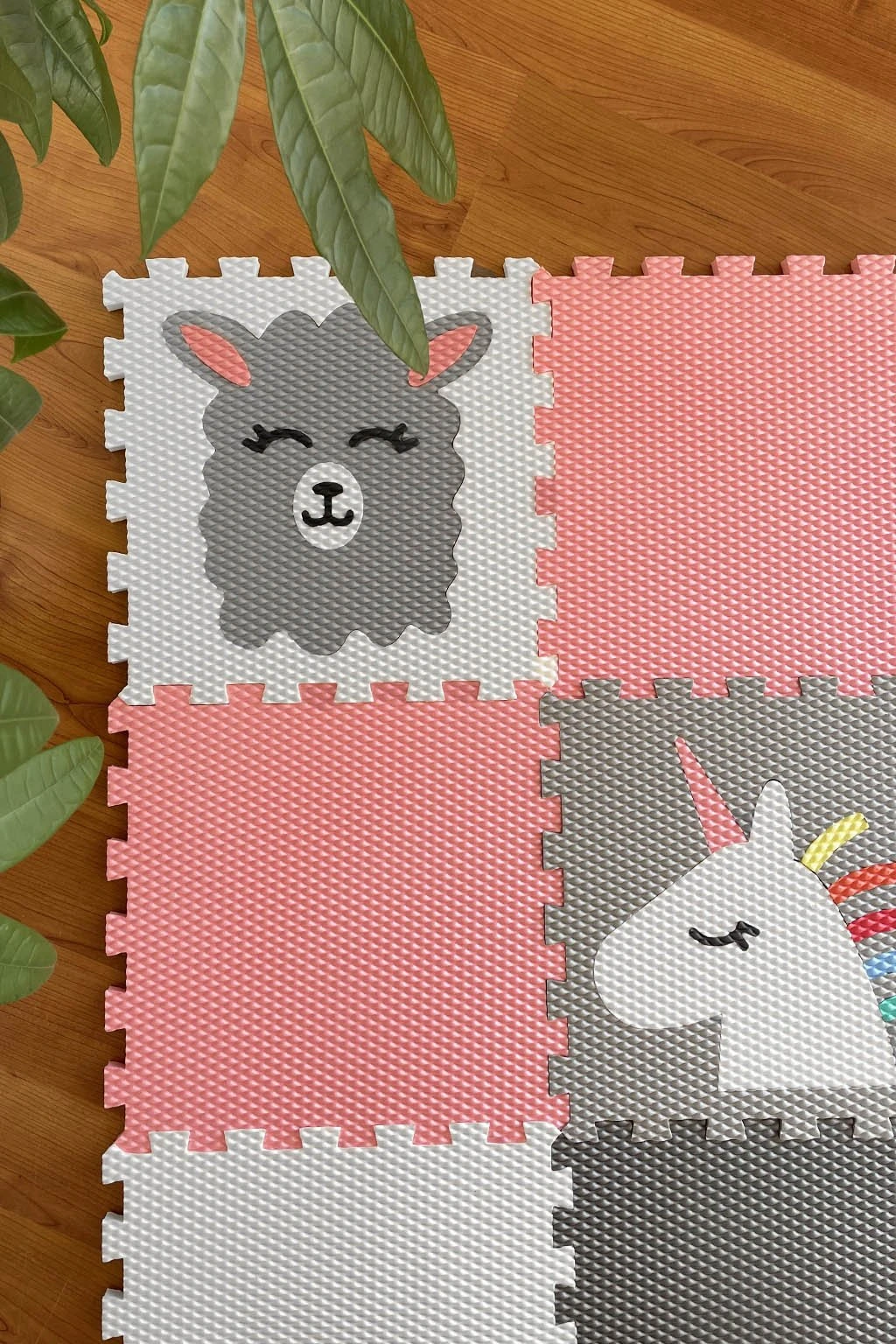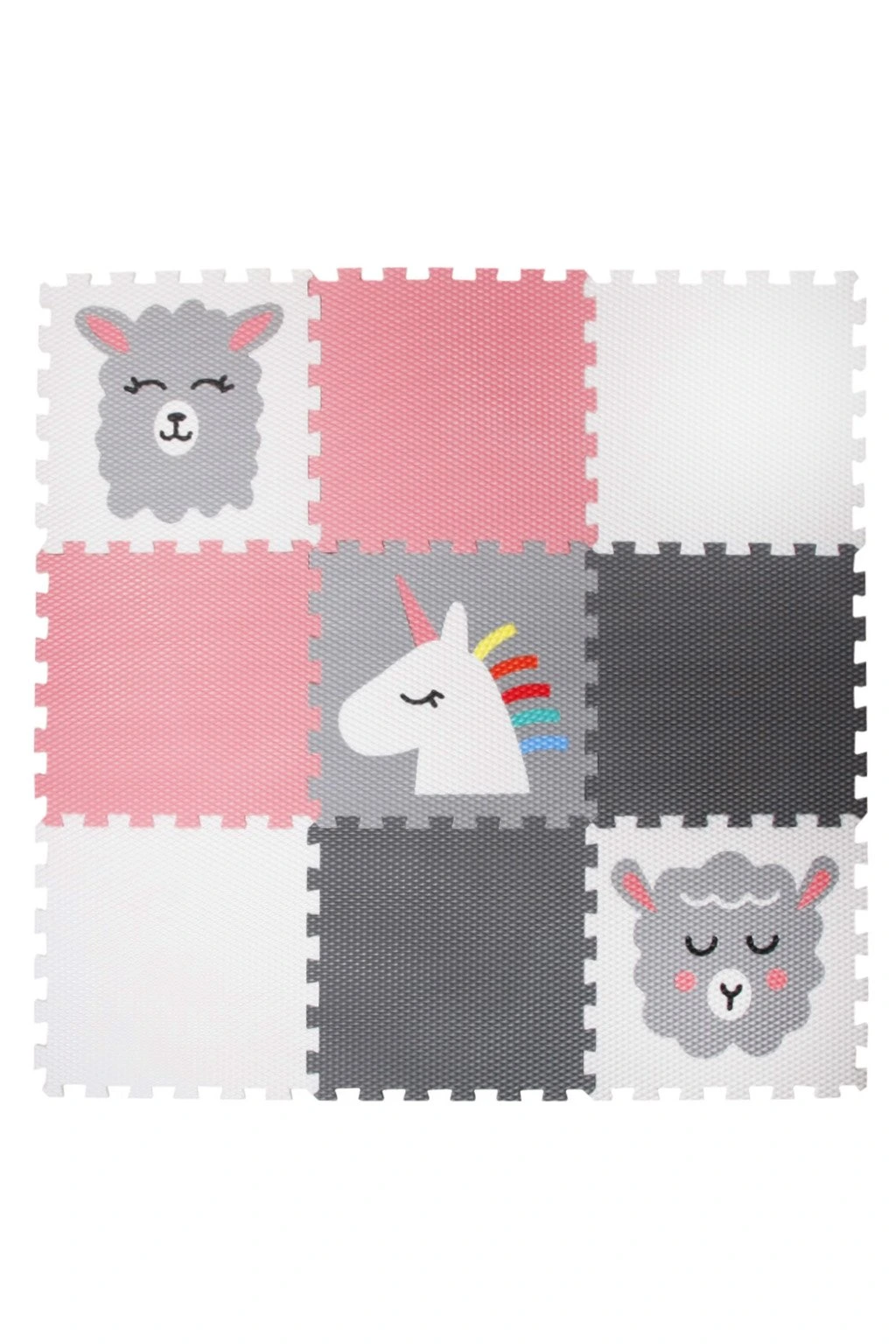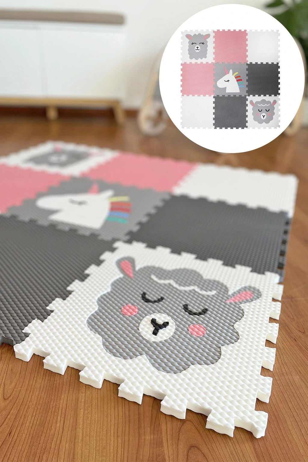 Dětská pěnová puzzle podlaha Minideckfloor nabízí měkkou a bezpečnou hrací plochu s veselými motivy beránka, jednorožce a lamy. Sada obsahuje 9 dílů, které lze snadno spojovat i rozšiřovat. Podlaha skvěle tlumí nárazy, izoluje od chladu a je ideální pro hraní, lezení i první krůčky.