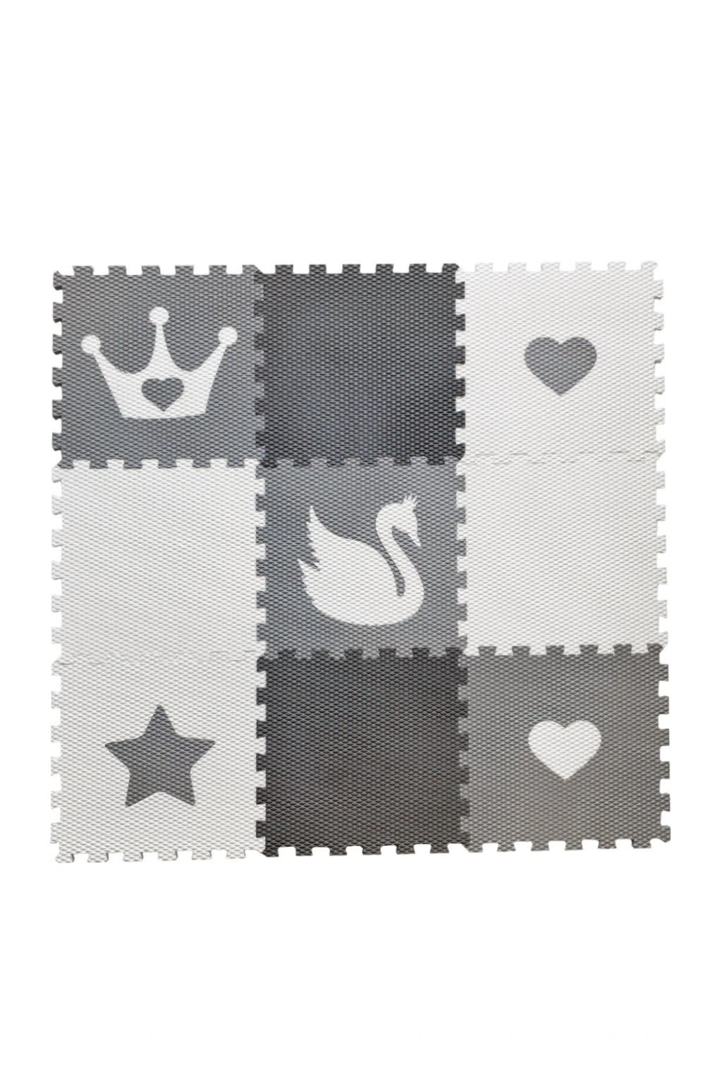Dětská pěnová puzzle podlaha Minideckfloor nabízí měkkou a bezpečnou hrací plochu s veselými motivy hvězdy, srdce, labutě a korunky. Sada obsahuje 9 dílů, které lze snadno spojovat i rozšiřovat. Podlaha skvěle tlumí nárazy, izoluje od chladu a je ideální pro hraní, lezení i první krůčky.