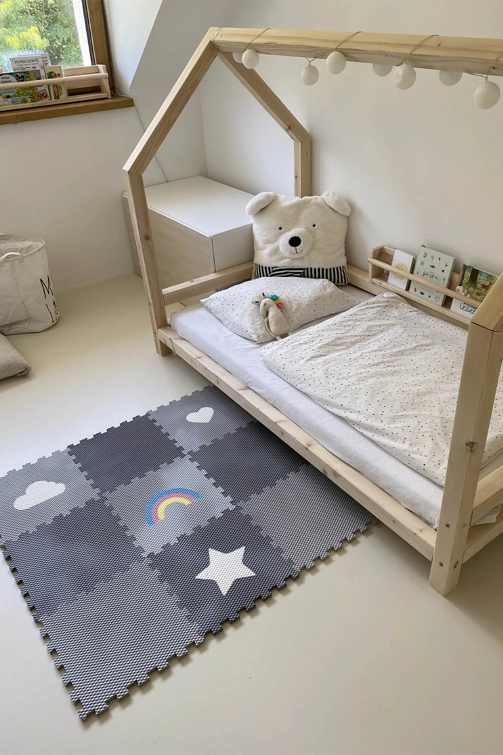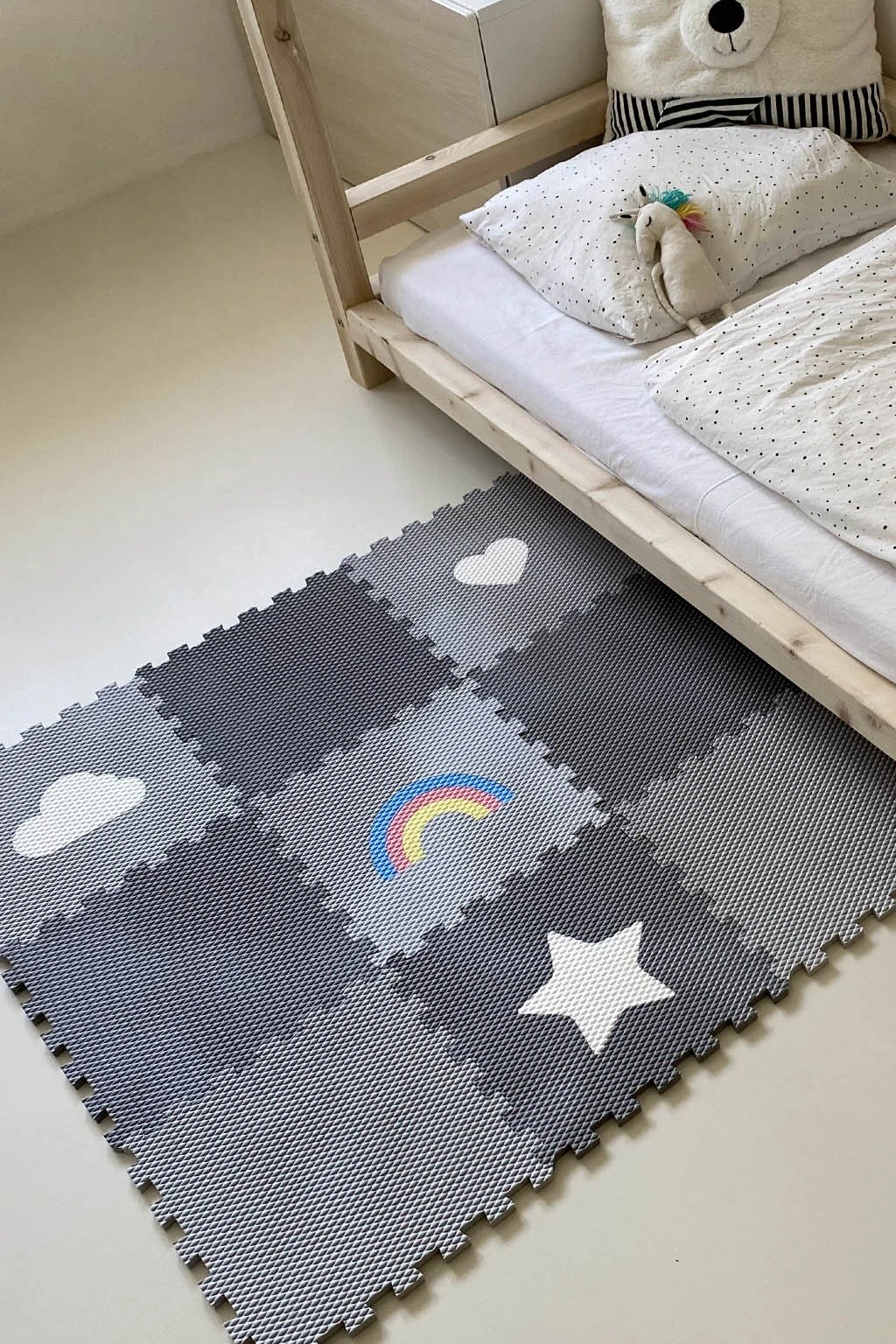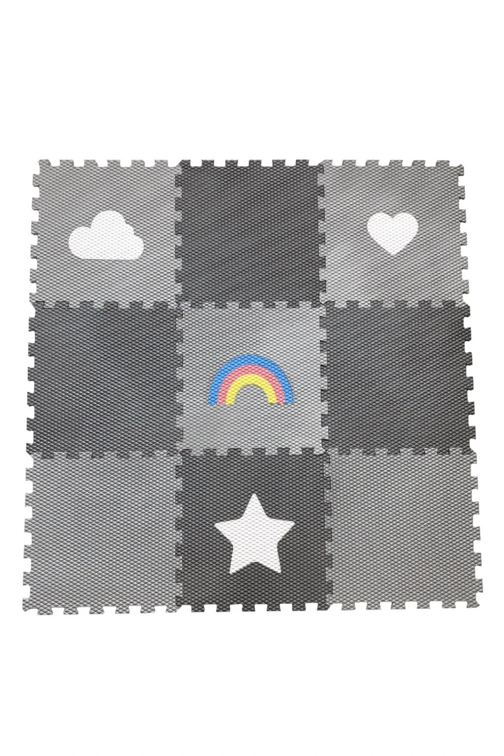Dětská pěnová puzzle podlaha Minideckfloor nabízí měkkou a bezpečnou hrací plochu s veselými motivy hvězdy, srdce, mraku a duhy. Sada obsahuje 9 dílů, které lze snadno spojovat i rozšiřovat. Podlaha skvěle tlumí nárazy, izoluje od chladu a je ideální pro hraní, lezení i první krůčky.