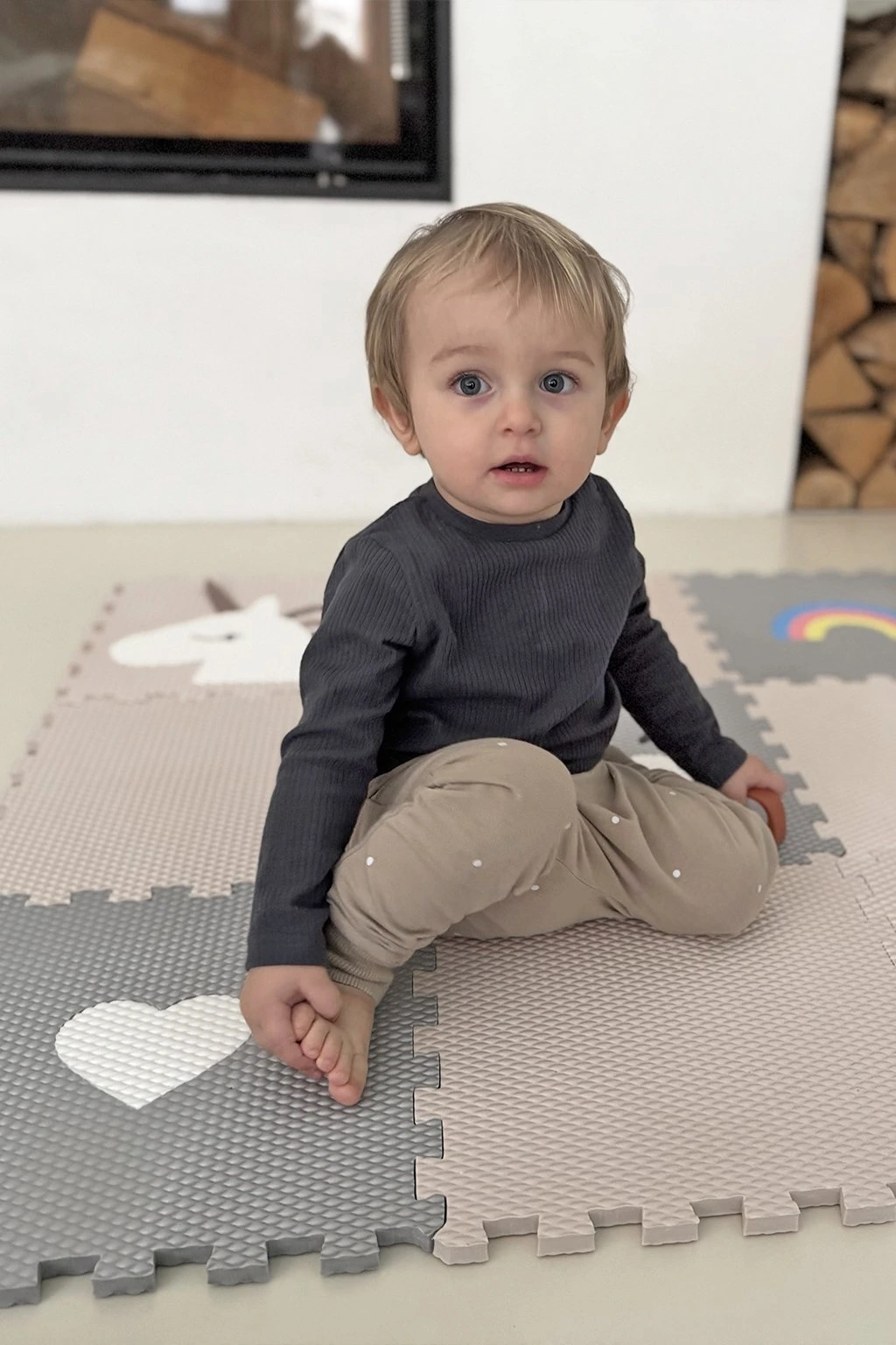 Dětská pěnová puzzle podlaha Minideckfloor nabízí měkkou a bezpečnou hrací plochu s veselými motivy jednorožce, duhy, tuleně, kolouška a srdíčka. Sada obsahuje 9 dílů, které lze snadno spojovat i rozšiřovat. Podlaha skvěle tlumí nárazy, izoluje od chladu a je ideální pro hraní, lezení i první krůčky.