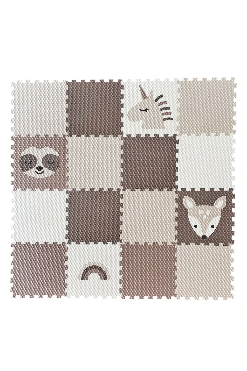 Dětská pěnová puzzle podlaha Minideckfloor nabízí měkkou a bezpečnou hrací plochu s veselými motivy jednorožce, lenochoda, kolouška a duhy. Sada obsahuje 16 dílů, které lze snadno spojovat i rozšiřovat. Podlaha skvěle tlumí nárazy, izoluje od chladu a je ideální pro hraní, lezení i první krůčky.