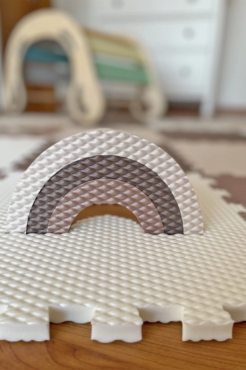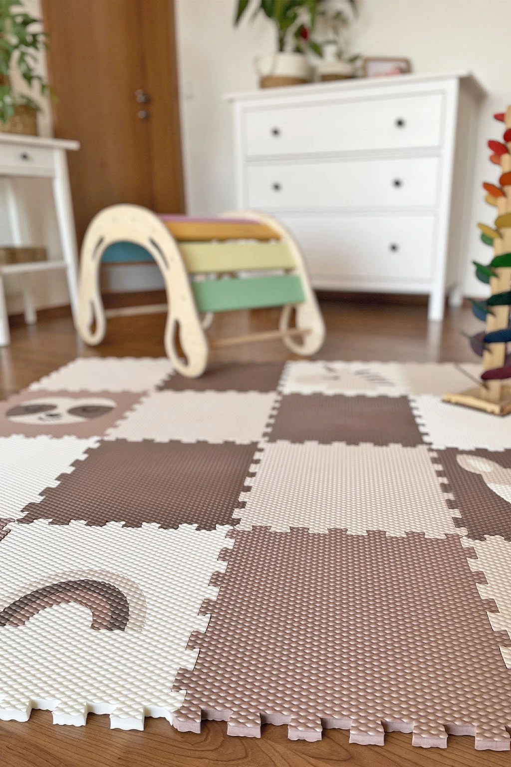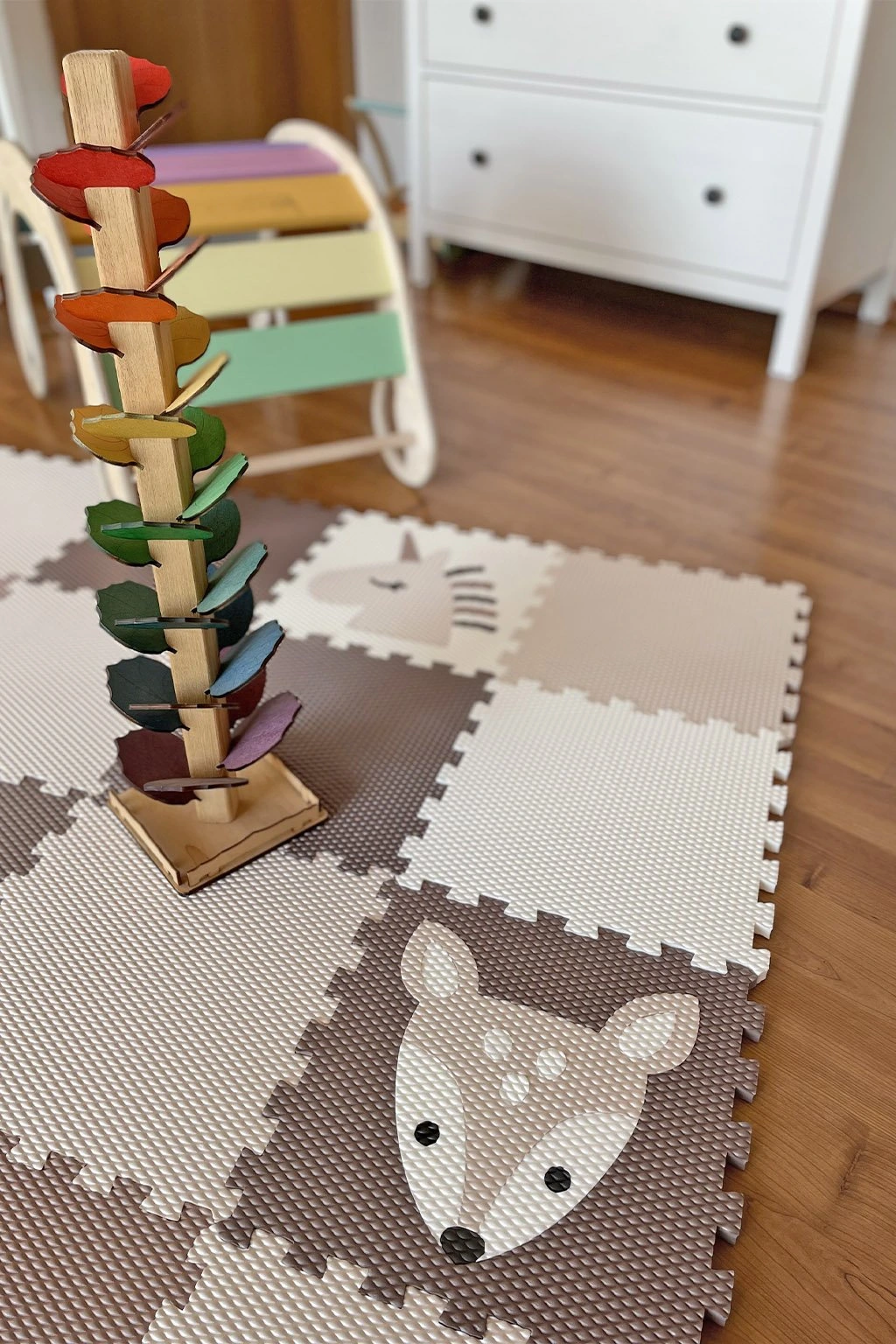Díky tomu, že všechny díly jsou vyndavací a snadno sestavitelné, se z podlahy stává skvělá skládačka, která zabaví děti na celé hodiny. Nejenže si s nimi pohrají, ale také budou rozvíjet jemnou motoriku, logické myšlení a kreativitu. Zároveň je podlaha vyrobená tak, aby šla přesouvat, aniž by se vám rozpadla. Vnitřní díly jsou o trošku větší než otvory do kterých se vkládají a tak uvnitř dobře drží. Design totiž dělají detaily.