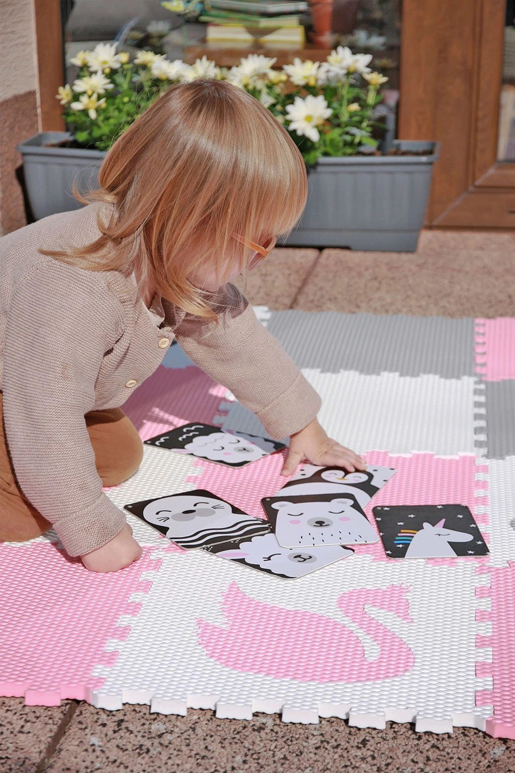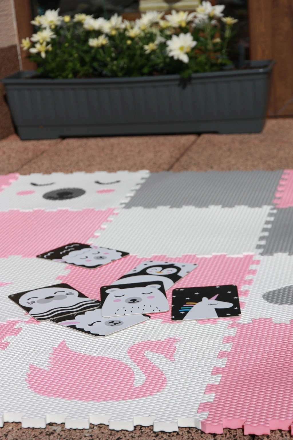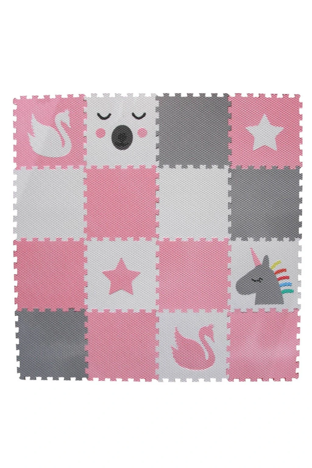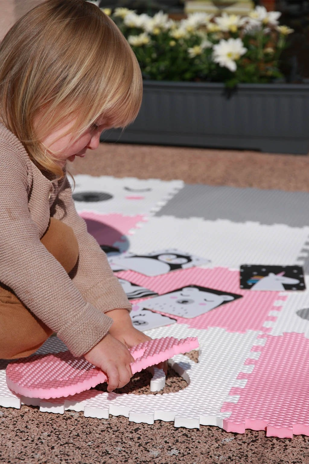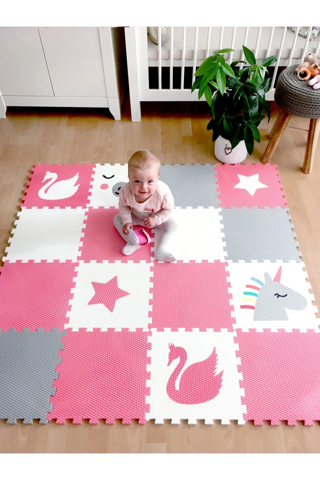 Dětská pěnová puzzle podlaha Minideckfloor nabízí měkkou a bezpečnou hrací plochu s veselými motivy jednorožce, médi, labutě a hvězdy. Sada obsahuje 16 dílů, které lze snadno spojovat i rozšiřovat. Podlaha skvěle tlumí nárazy, izoluje od chladu a je ideální pro hraní, lezení i první krůčky.
