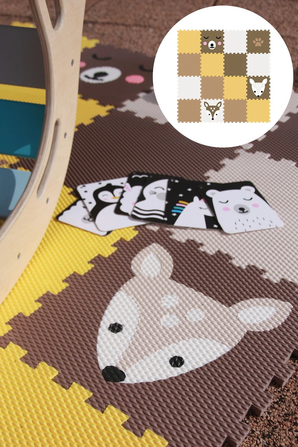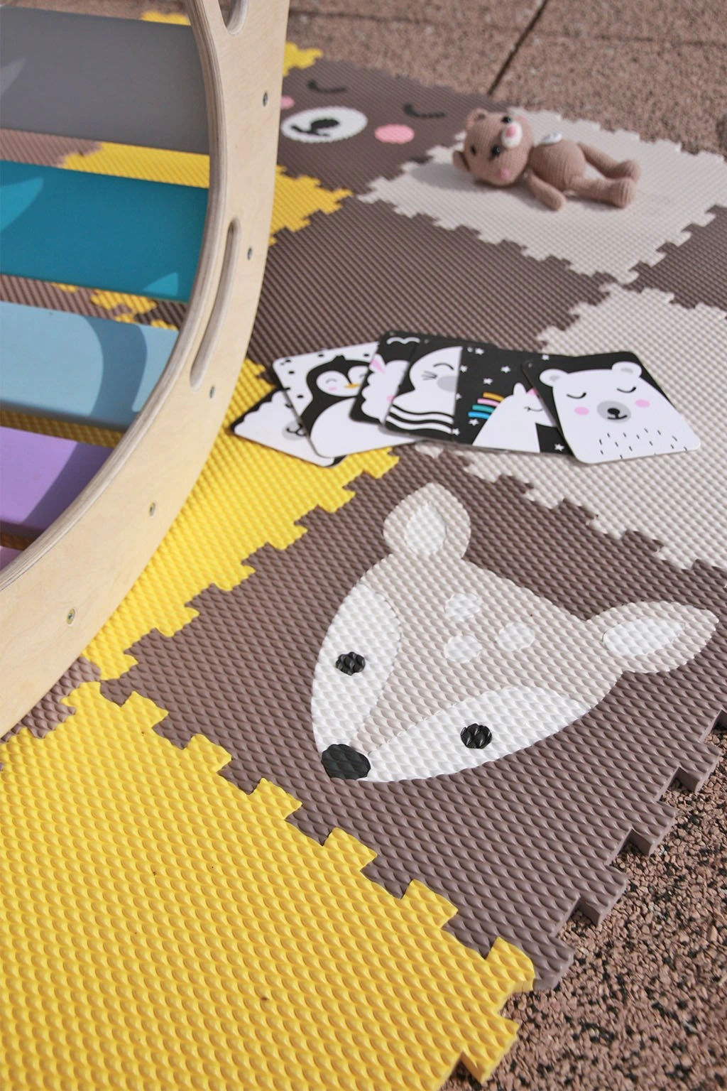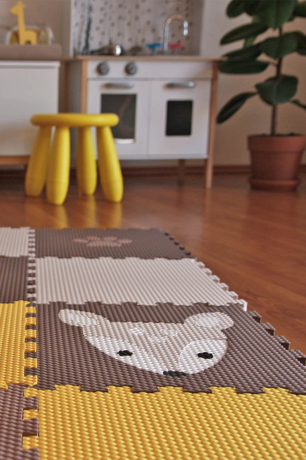 Dětská pěnová puzzle podlaha Minideckfloor nabízí měkkou a bezpečnou hrací plochu s veselými motivy koloušků, médi a tlapek. Sada obsahuje 16 dílů, které lze snadno spojovat i rozšiřovat. Podlaha skvěle tlumí nárazy, izoluje od chladu a je ideální pro hraní, lezení i první krůčky.