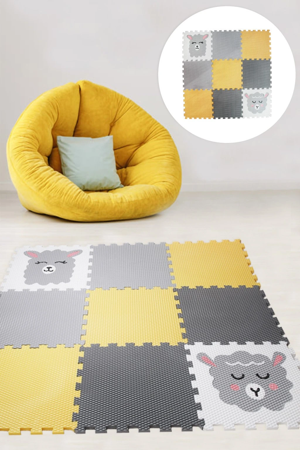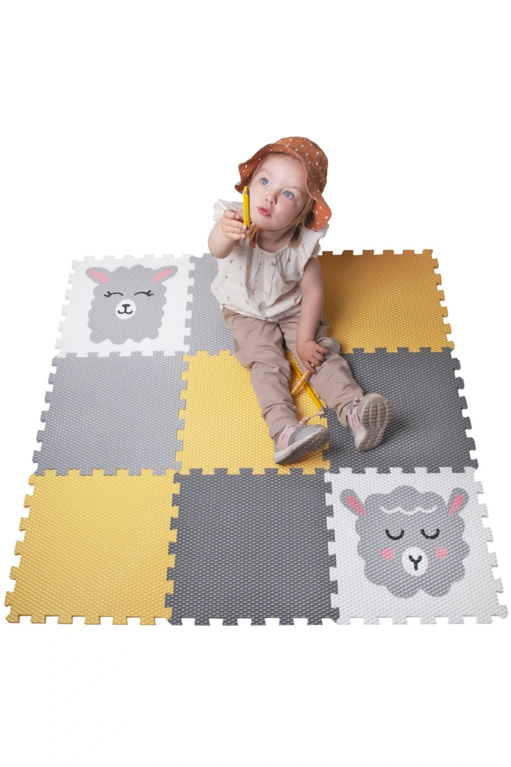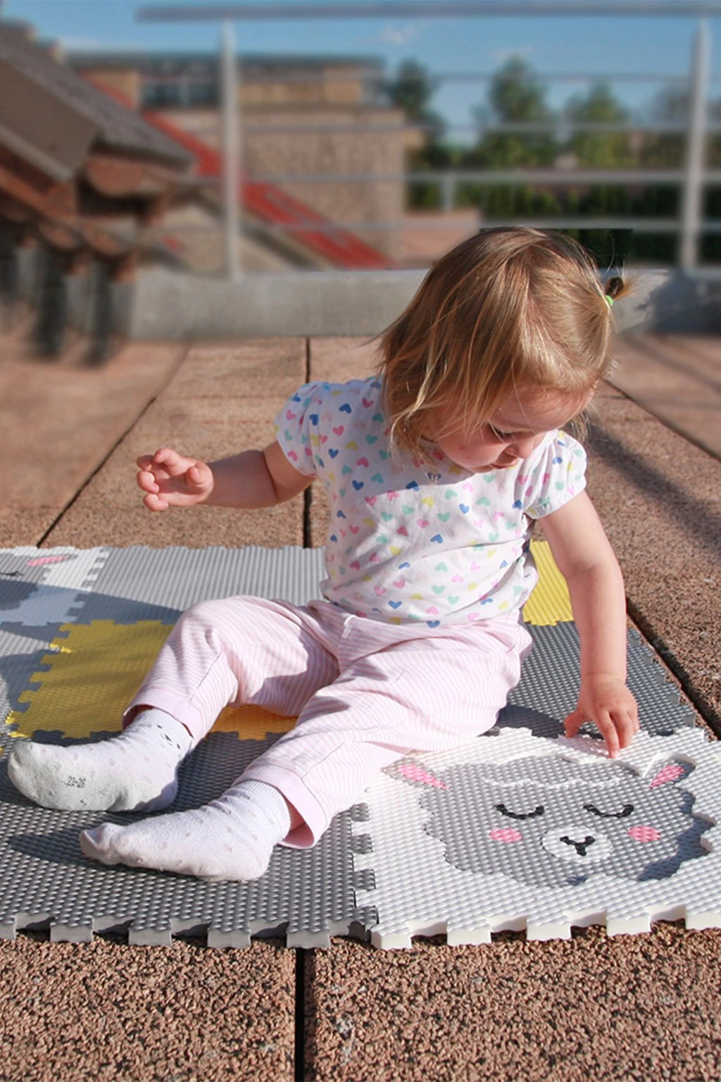 Dětská pěnová puzzle podlaha Minideckfloor nabízí měkkou a bezpečnou hrací plochu s veselými motivy lamy a beránka. Sada obsahuje 9 dílů, které lze snadno spojovat i rozšiřovat. Podlaha skvěle tlumí nárazy, izoluje od chladu a je ideální pro hraní, lezení i první krůčky.