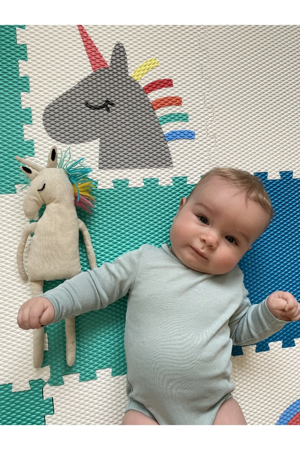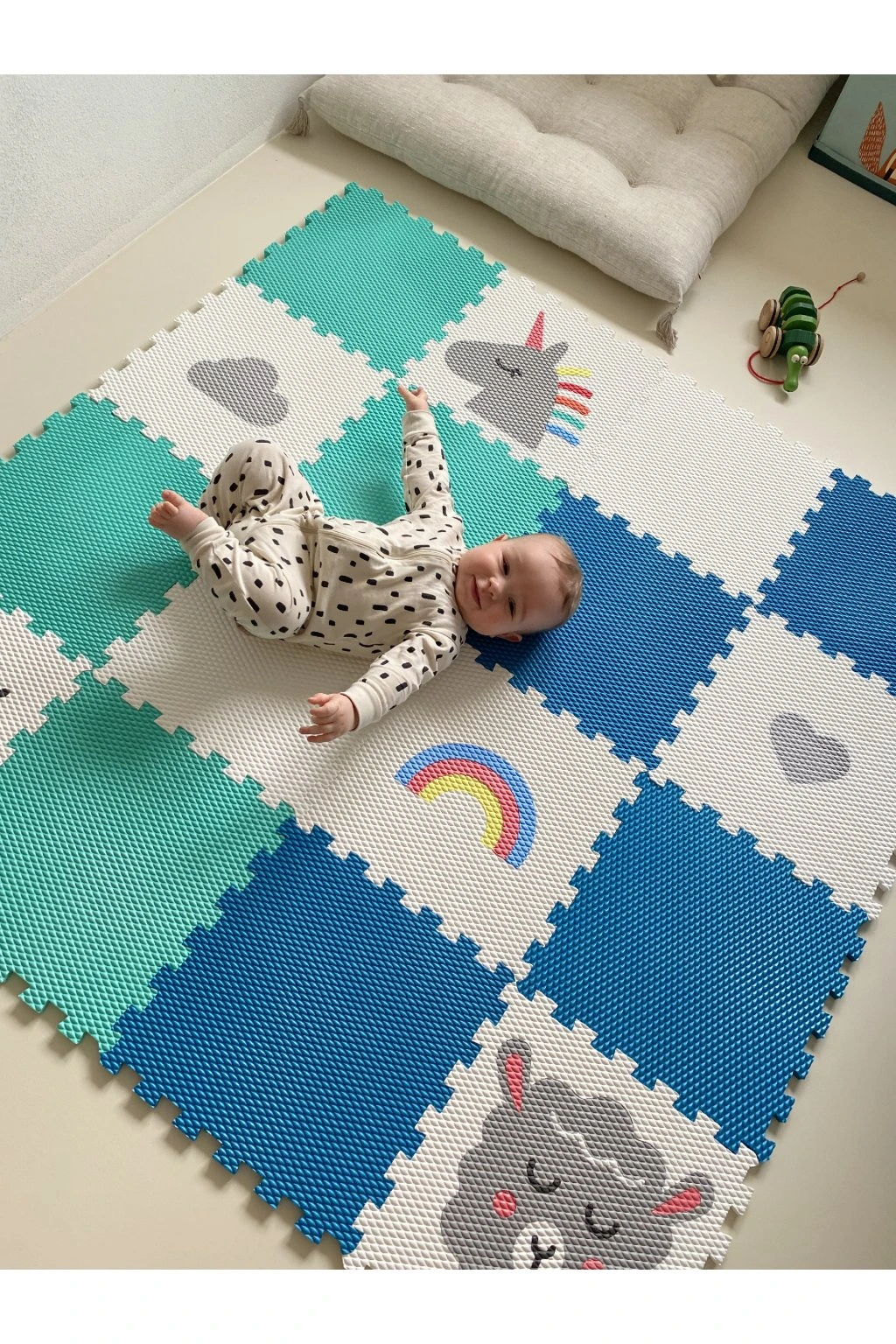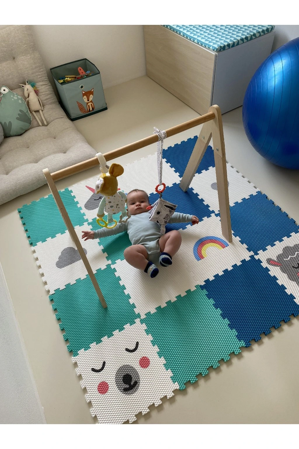 Dětská pěnová puzzle podlaha Minideckfloor nabízí měkkou a bezpečnou hrací plochu s veselými motivy médi, beránka, jednorožce, duhy, mráčku a srdíčka. Sada obsahuje 16 dílů, které lze snadno spojovat i rozšiřovat. Podlaha skvěle tlumí nárazy, izoluje od chladu a je ideální pro hraní, lezení i první krůčky.