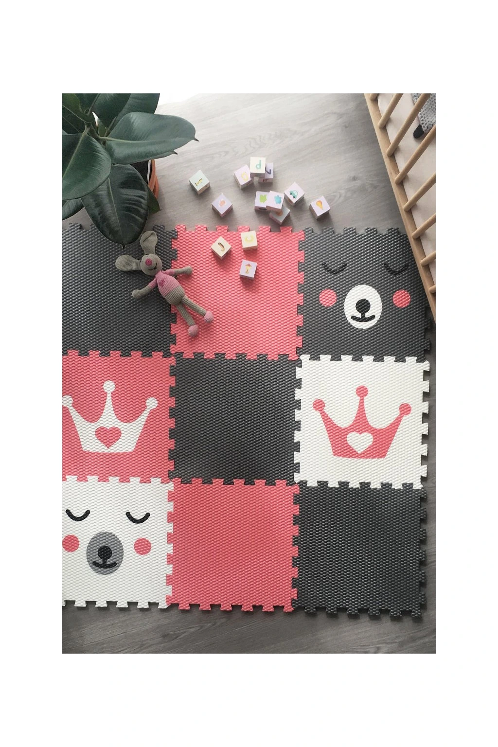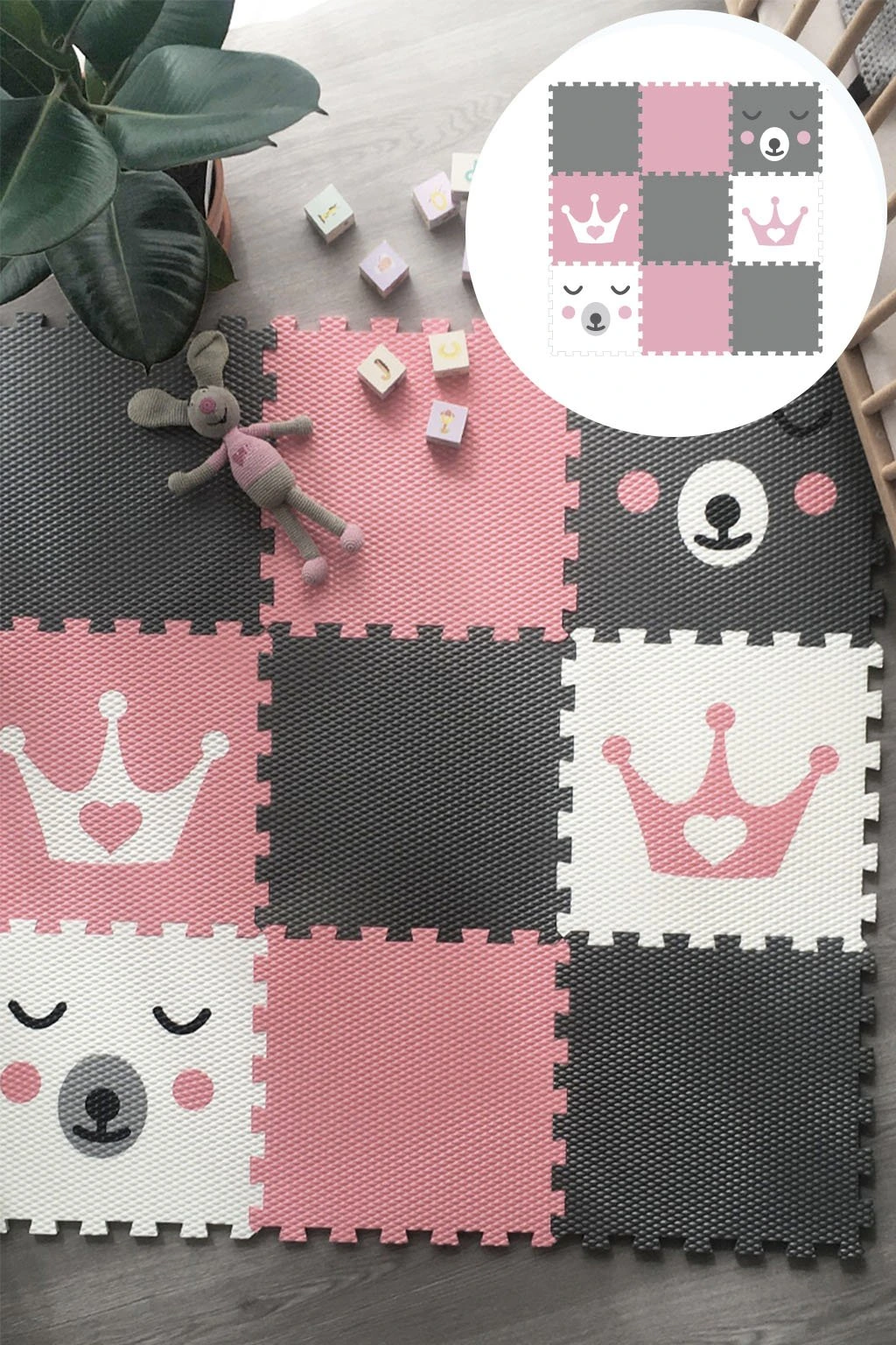 Dětská pěnová puzzle podlaha Minideckfloor nabízí měkkou a bezpečnou hrací plochu s veselými motivy médi a korunky. Sada obsahuje 9 dílů, které lze snadno spojovat i rozšiřovat. Podlaha skvěle tlumí nárazy, izoluje od chladu a je ideální pro hraní, lezení i první krůčky.