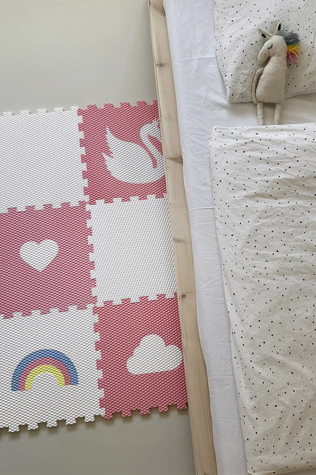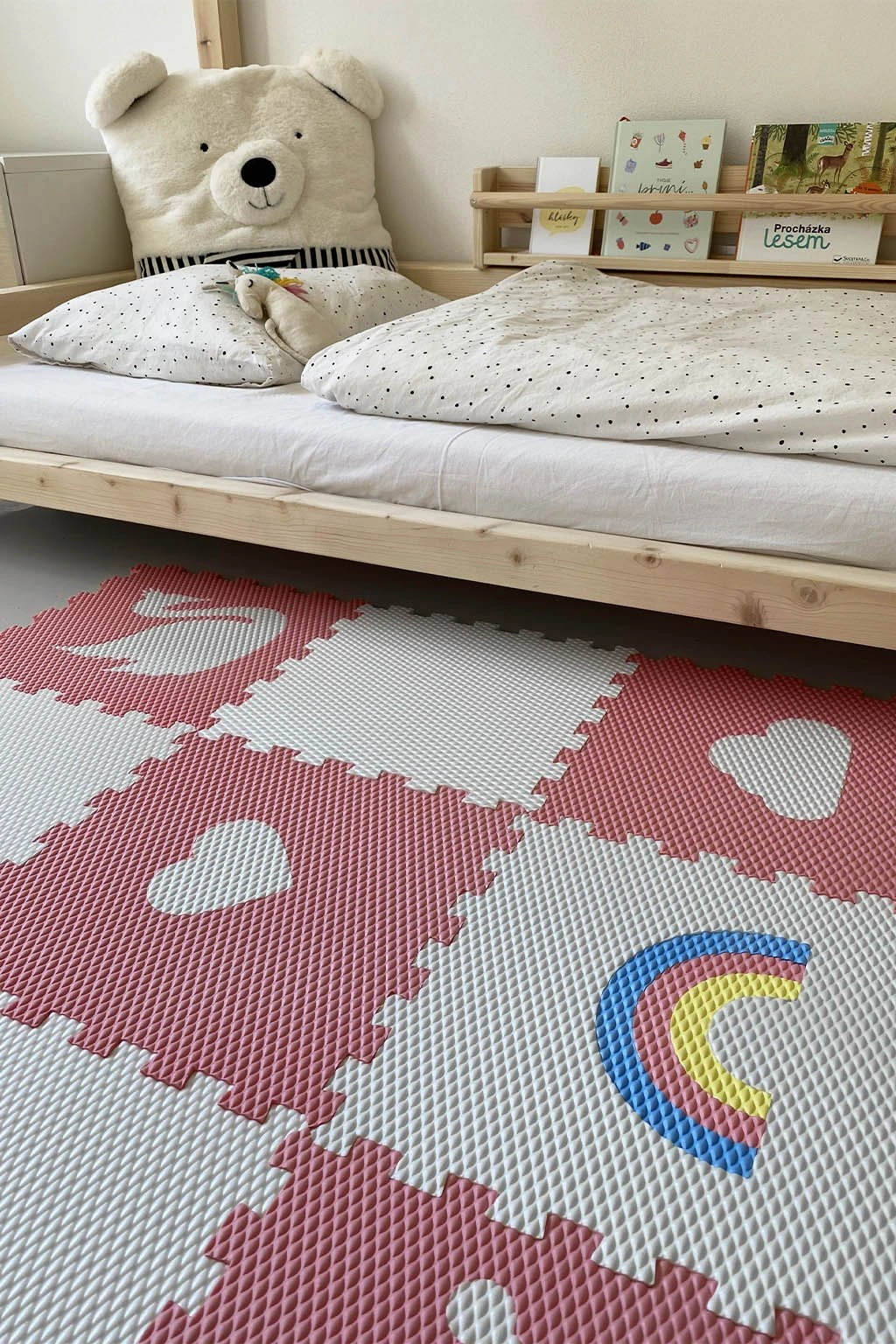 Dětská pěnová puzzle podlaha Minideckfloor nabízí měkkou a bezpečnou hrací plochu s veselými motivy mráčku, hvězdy, labutě, srdce, korunky a duhy. Sada obsahuje 9 dílů, které lze snadno spojovat i rozšiřovat. Podlaha skvěle tlumí nárazy, izoluje od chladu a je ideální pro hraní, lezení i první krůčky.