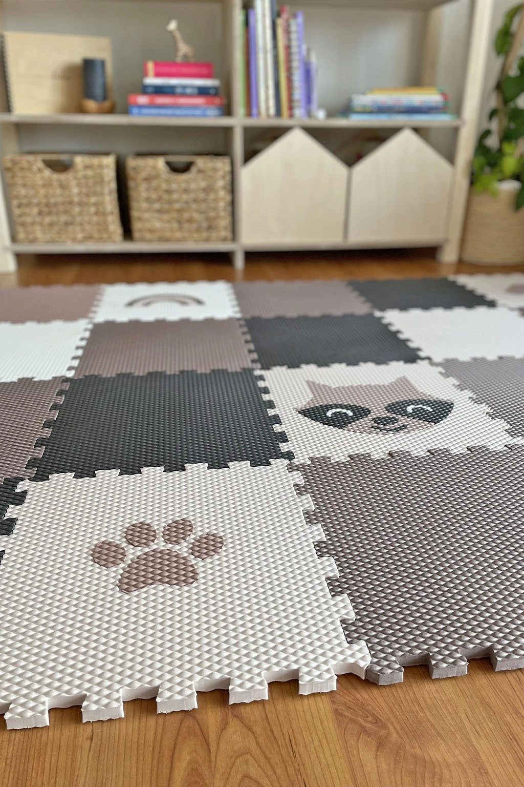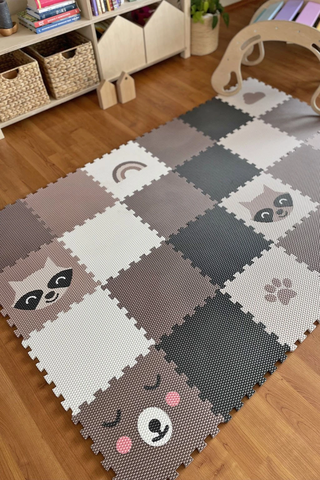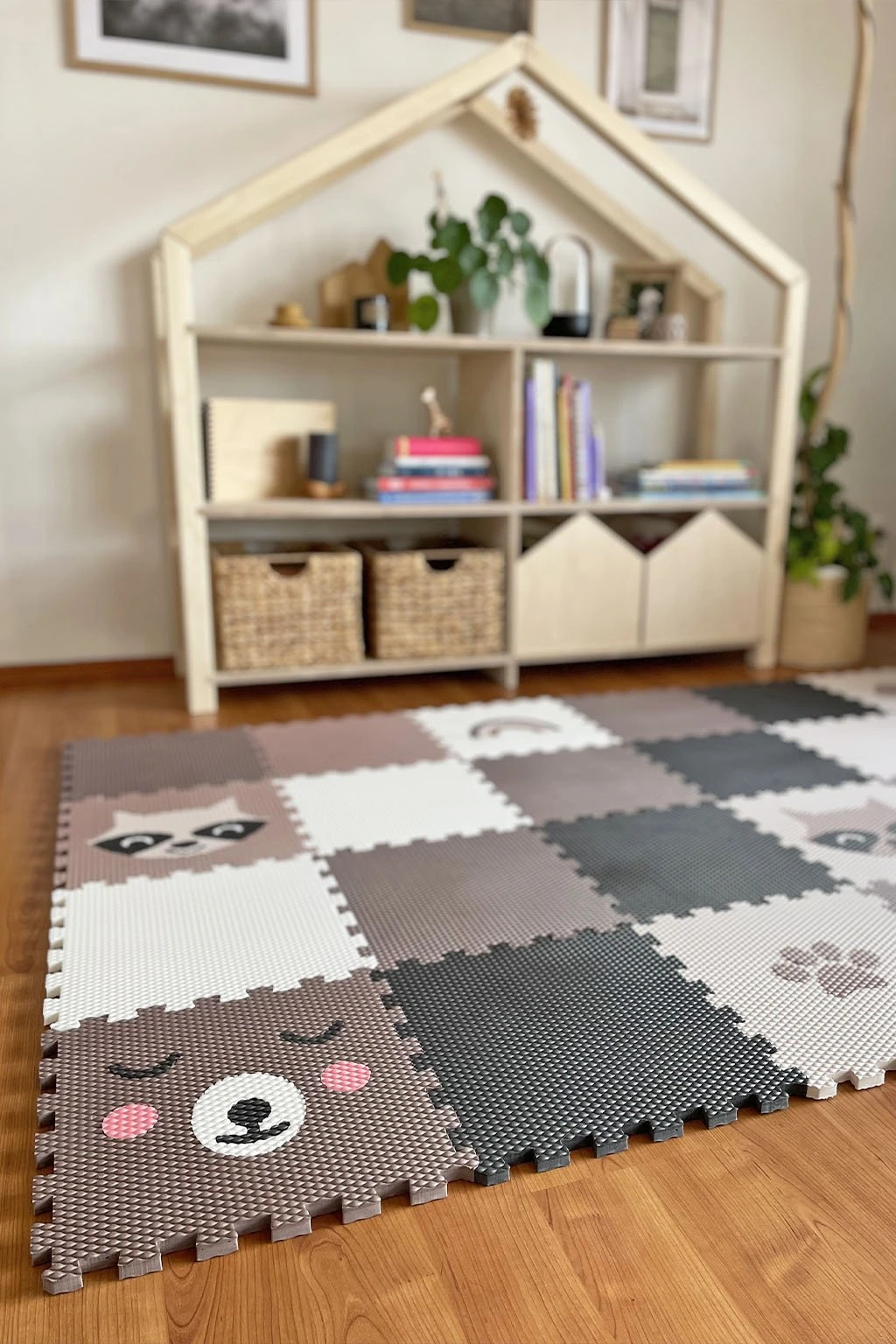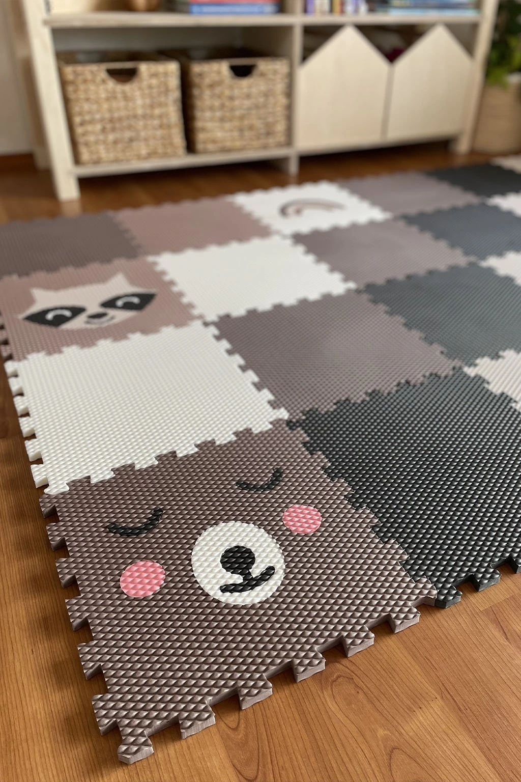 Dětská pěnová puzzle podlaha Minideckfloor nabízí měkkou a bezpečnou hrací plochu s veselými motivy mývalů, duhy, médi a mráčku. Sada obsahuje 24 dílů, které lze snadno spojovat i rozšiřovat. Podlaha skvěle tlumí nárazy, izoluje od chladu a je ideální pro hraní, lezení i první krůčky.