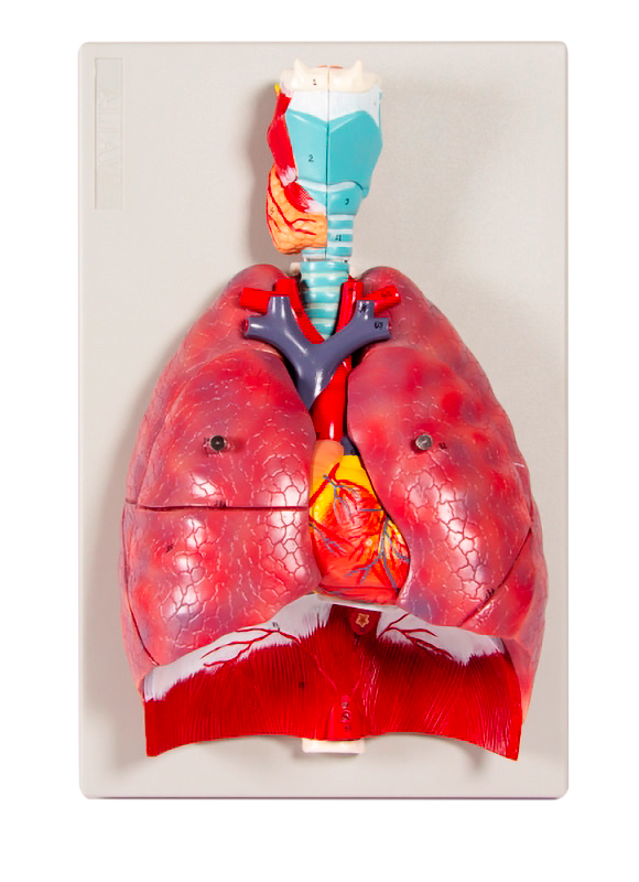 Model lidského dýchacího systému se skládá ze 7 částí, které zobrazují hrtan (rozříznutý v sagitální rovině), plíce (rozříznuté ve frontální rovině) a dvoudílné srdce. Připevněno na podstavci