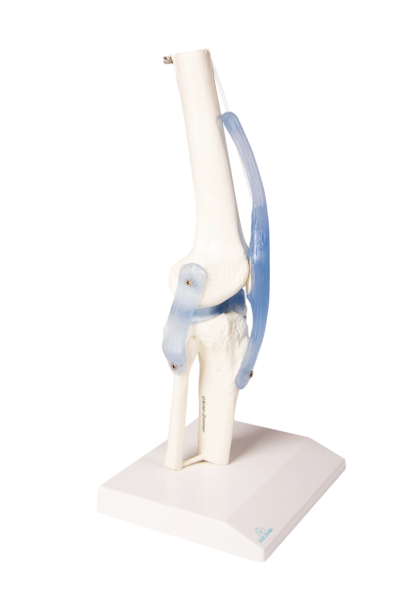 Anatomický model zobrazuje přirozenou stavbu lidského kolenního kloubu. Model kolenního kloubu s vazy obsahuje část stehenní kosti, část bérce a čéšku, stabilizační struktury (menisky a vazy). Vazy jsou vyrobené z elastického syntetického materiálu a model tak umožňuje demonstrovat hlavní pohyby kolenního kloubu – ohnutí, natažení a mírné boční pohyby.
