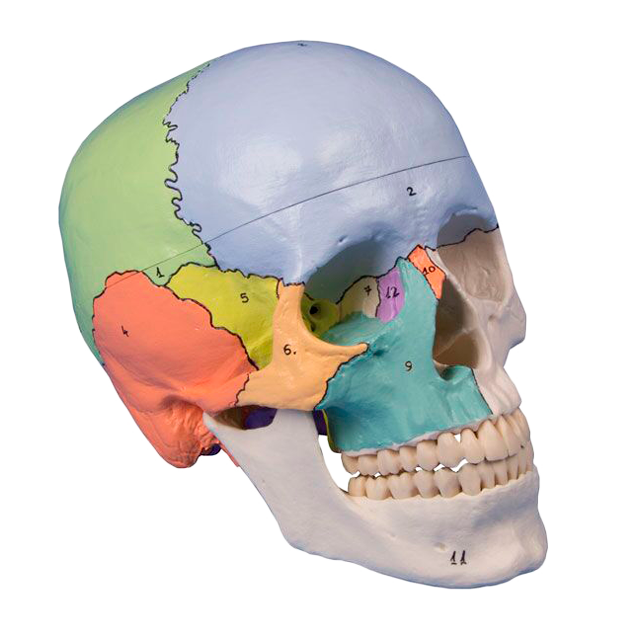 Při vývoji tohoto modelu lidské lebky jsme použili nejnovější technologii pro digitalizaci reálné lidské lebky a idealizovali ji podle aspektů zdravotnické výchovy. To znamená, že lebka byla upravena tak, aby byla anatomicky věrná a aby zachycovala všechny anatomické detaily a struktury. Třídílný model se skládá z horní části lebky, spodní části lebky a dolní čelisti. Zuby odpovídají skutečnému chrupu. Dolní čelist je pohyblivá a je možné ji odstranit. Horní část lebky je se spodní částí zarovnána pomocí kovových kolíků, pevné spojení zajišťují silné magnety. Ke spojení tak nejsou nutné háčky a plastové kolíky, které by se mohly zlomit. To odlišuje tento model od konkurenčních modelů s plastovými kolíky a rušivými kovovými háčky. Model odpovídá rozměrům lebky průměrného dospělého evropana.