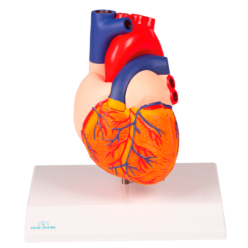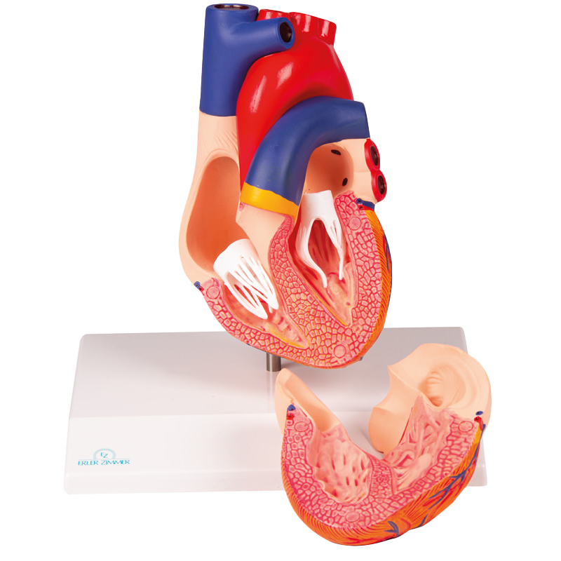 Pro detailní demonstraci vnitřních struktur je možné přední srdeční stěnu odejmout. Model zobrazuje všechny důležité struktury jako jsou: srdeční komory, síně, srdečnice, mitrální chlopeň, plicní a trikuspidální chlopně. Srdeční svaly, tukové tkáně, detailně jsou vykreslené tepny a žíly. Model je umístěný na odnímatelném stojanu a je vyrobený z nerozbitného plastu.