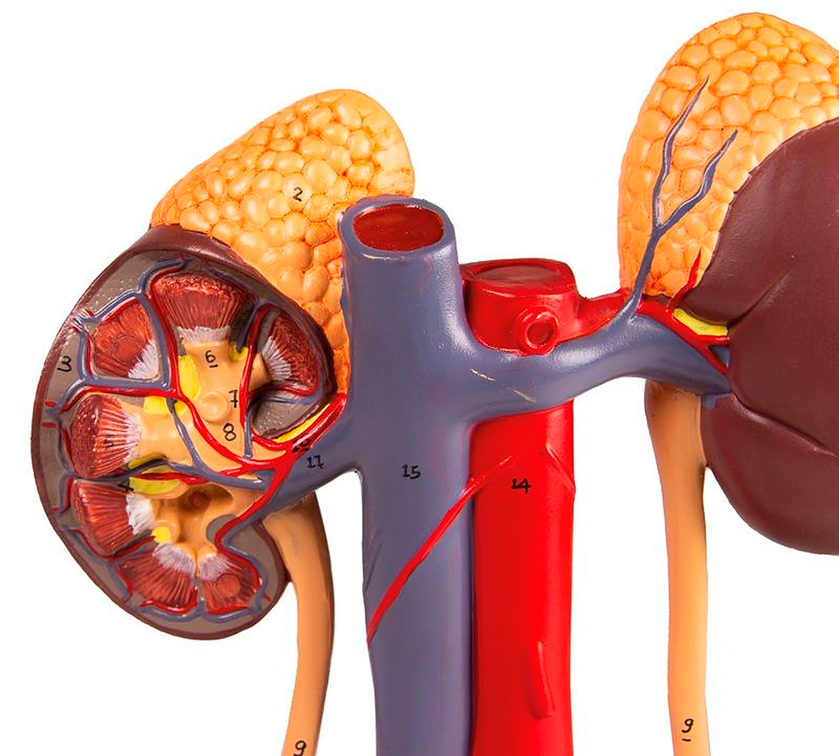 Pětidílný model vylučovací soustavy v životní velikosti představuje hlavní součásti močové soustavy, dutou žílu a břišní aortu.