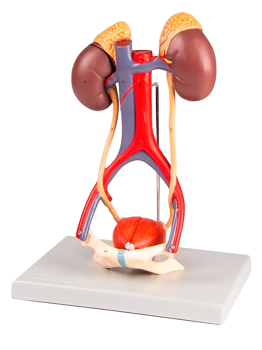 Pravá ledvina je rozříznuta tak, aby byla vidět kůra, dřeň, pyramidy, kalichy, pánvička a počátky ledvinové tepny a žíly. Močový měchýř lze otevřít a odhalit sliznici, trigon, močovou trubici, semenné váčky, ejakulační kanálky a chámovody. Připevněno na podstavci.