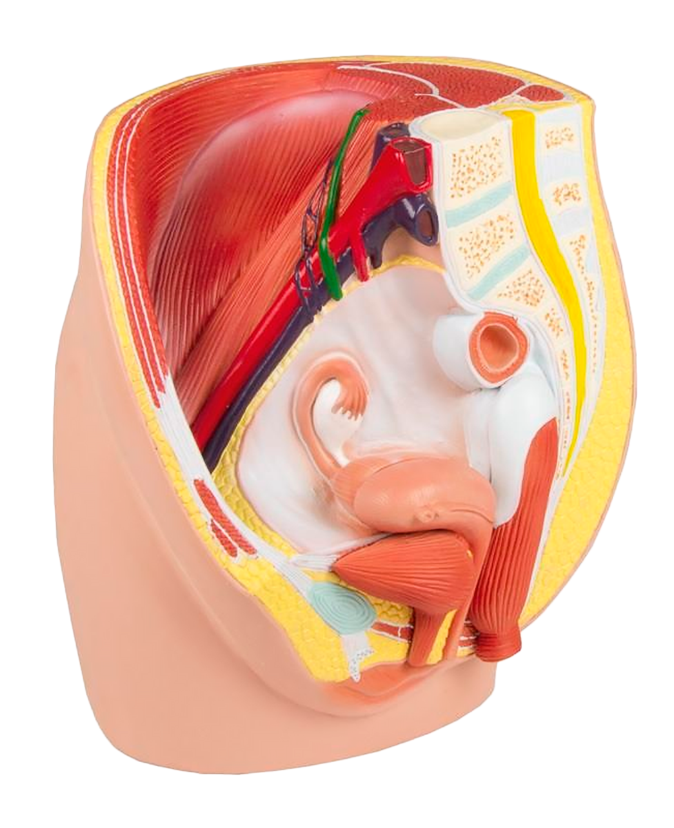 Model ženské pánve zobrazuje kromě svalů a cév břicha zejména urogenitální orgány. Odnímatelná je polovina dělohy, pochvy a močového měchýře a polovina střeva s konečníkem.