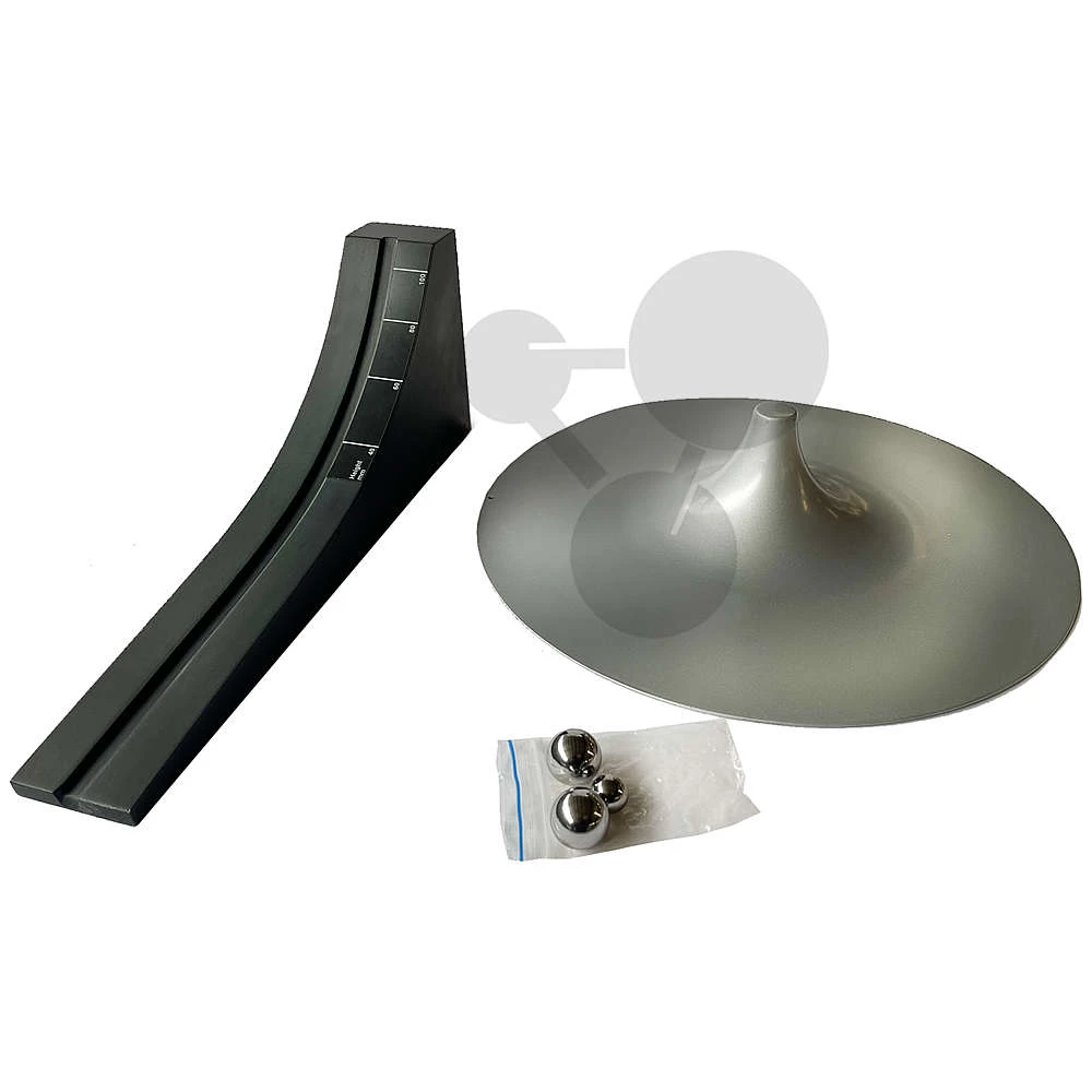 Kužel o průměru 28 cm, výška 6 cm; rampa 30x5x10,5 cm, ocelové kuličky.