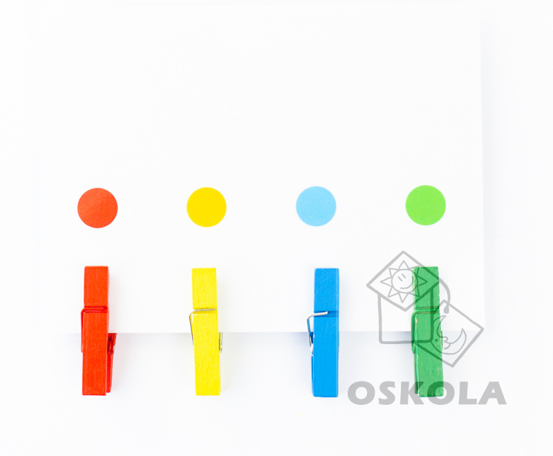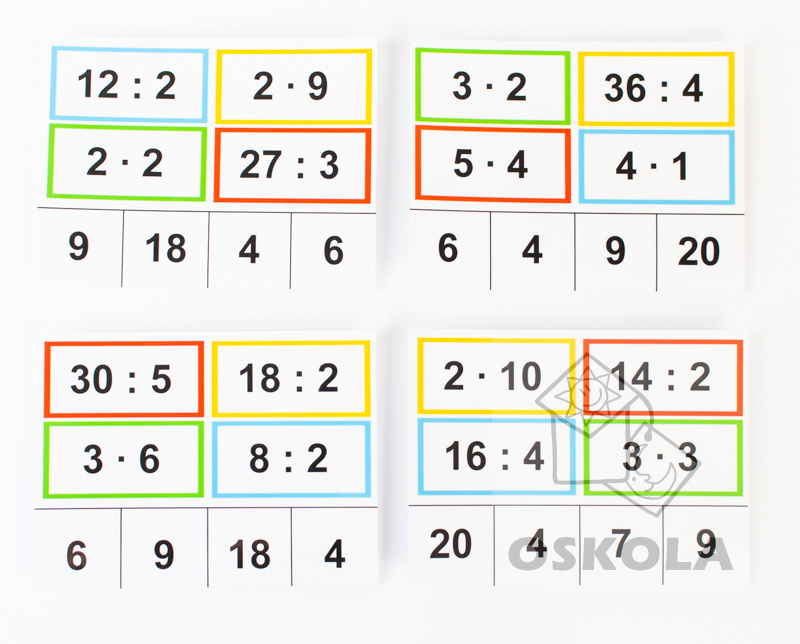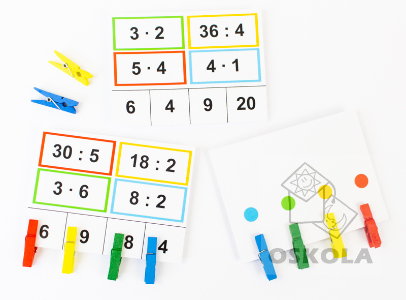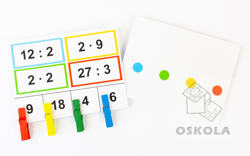Čtyři příklady, pro každý příklad jeden barevný kolíček, jen ho přiřadit ke správnému výsledku.