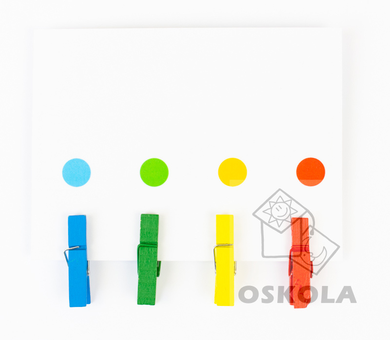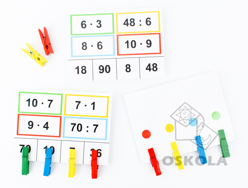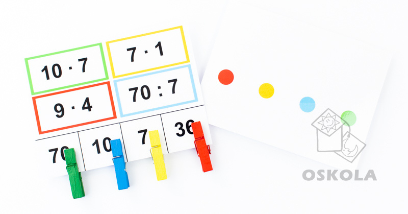 Čtyři příklady, pro každý příklad jeden barevný kolíček, jen ho přiřadit ke správnému výsledku.