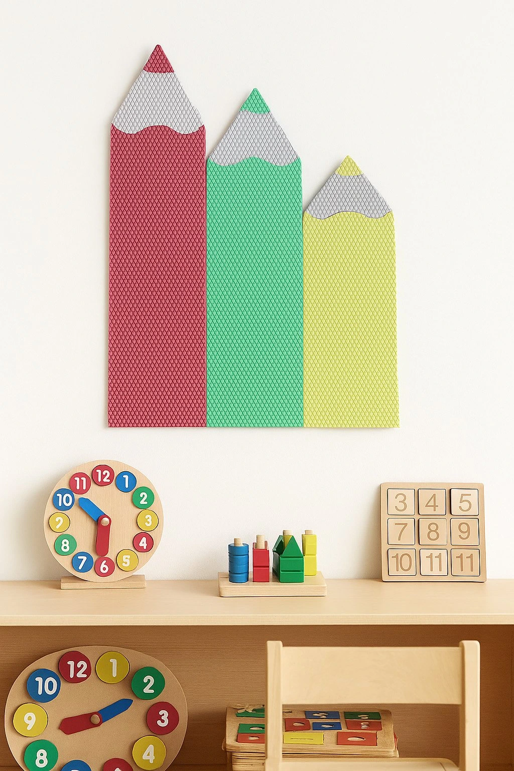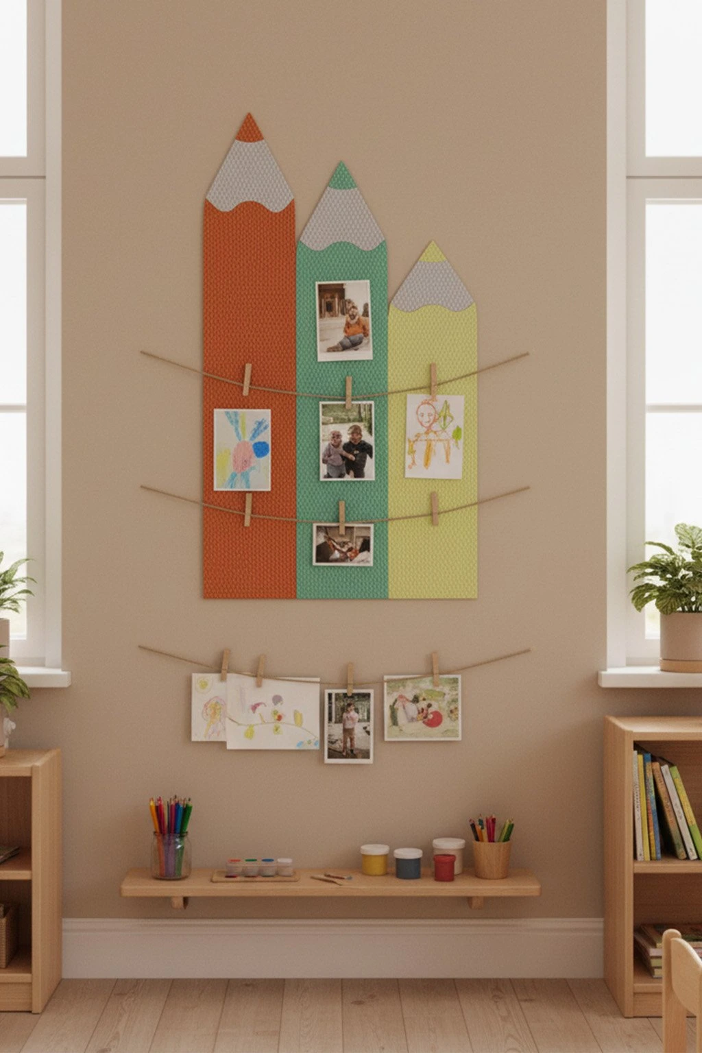 Veselá nástěnka ve tvaru pastelek promění zdi v barevné místo plné nápadů, obrázků a dětských výtvorů.